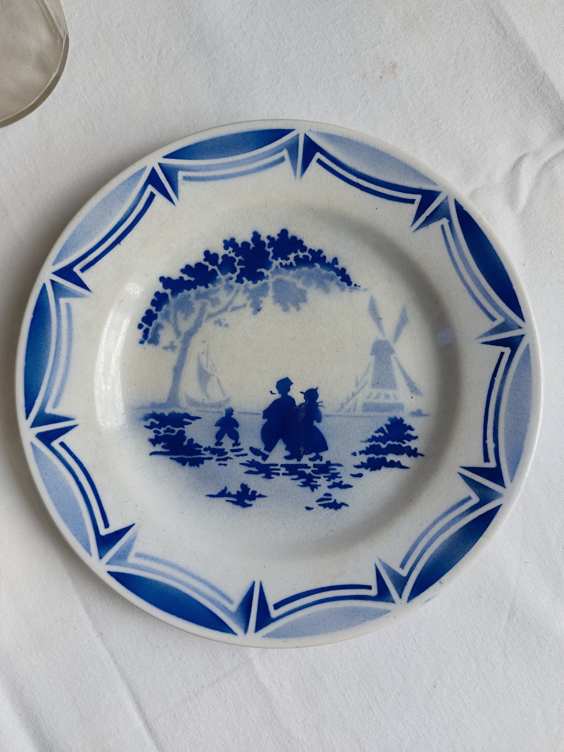 Une jolie paire d’assiette à dessert de la célèbre manufacture Hamage & Moulin des Loups. Le modèle présenté se nomme Polders en référence aux Pays-Bas. Les décors sont différents mais les deux se composent de silhouette de personnage au premier plan, puis de silhouette de bateau à voile et de moulin et un décor végétal. Le contour est orné d’un motif géométrique. L’ensemble des décors sont de couleur bleu sur une faïence fine blanche. Les deux assiettes sont estampillées. Elles sont en bon état.