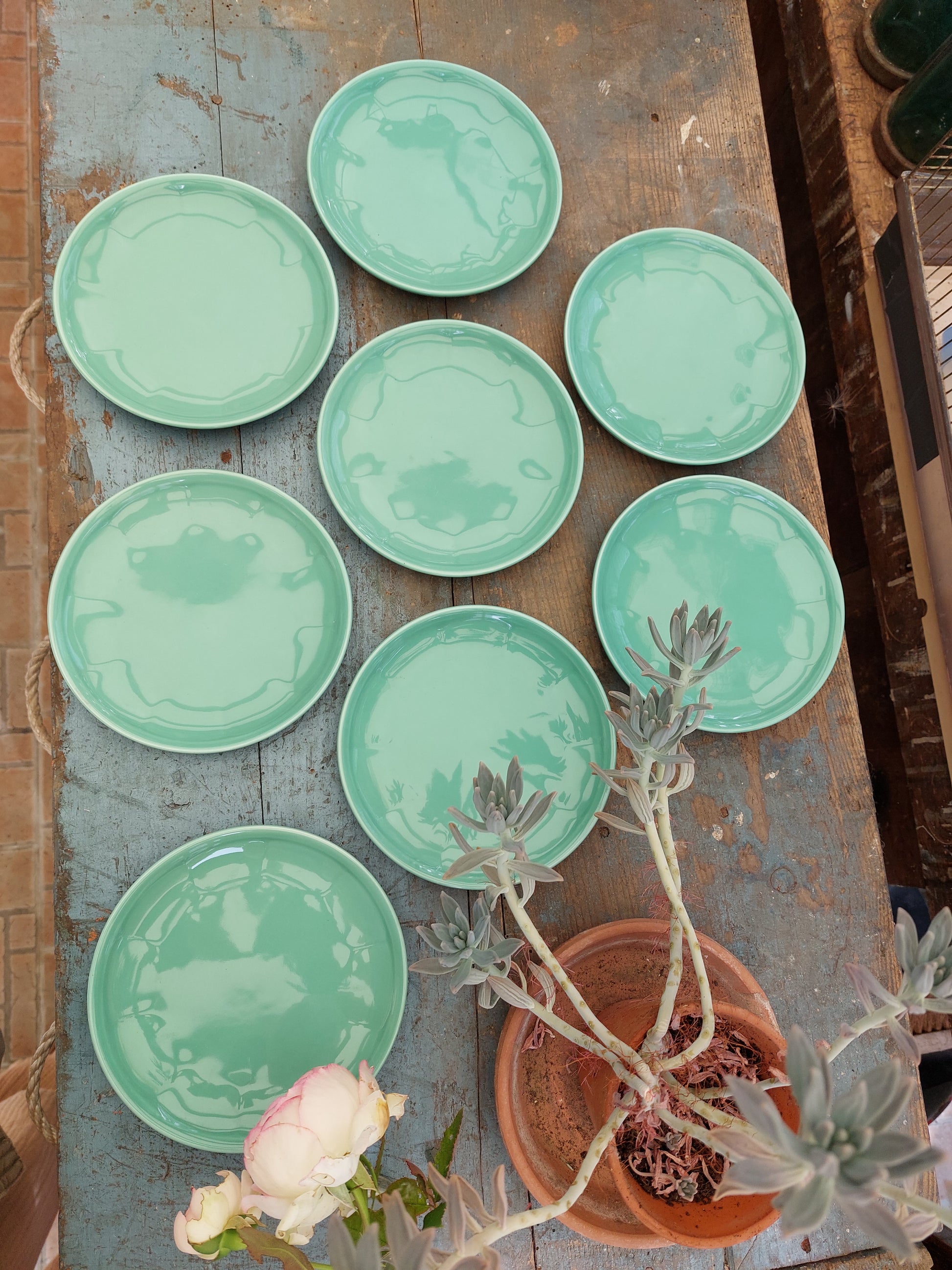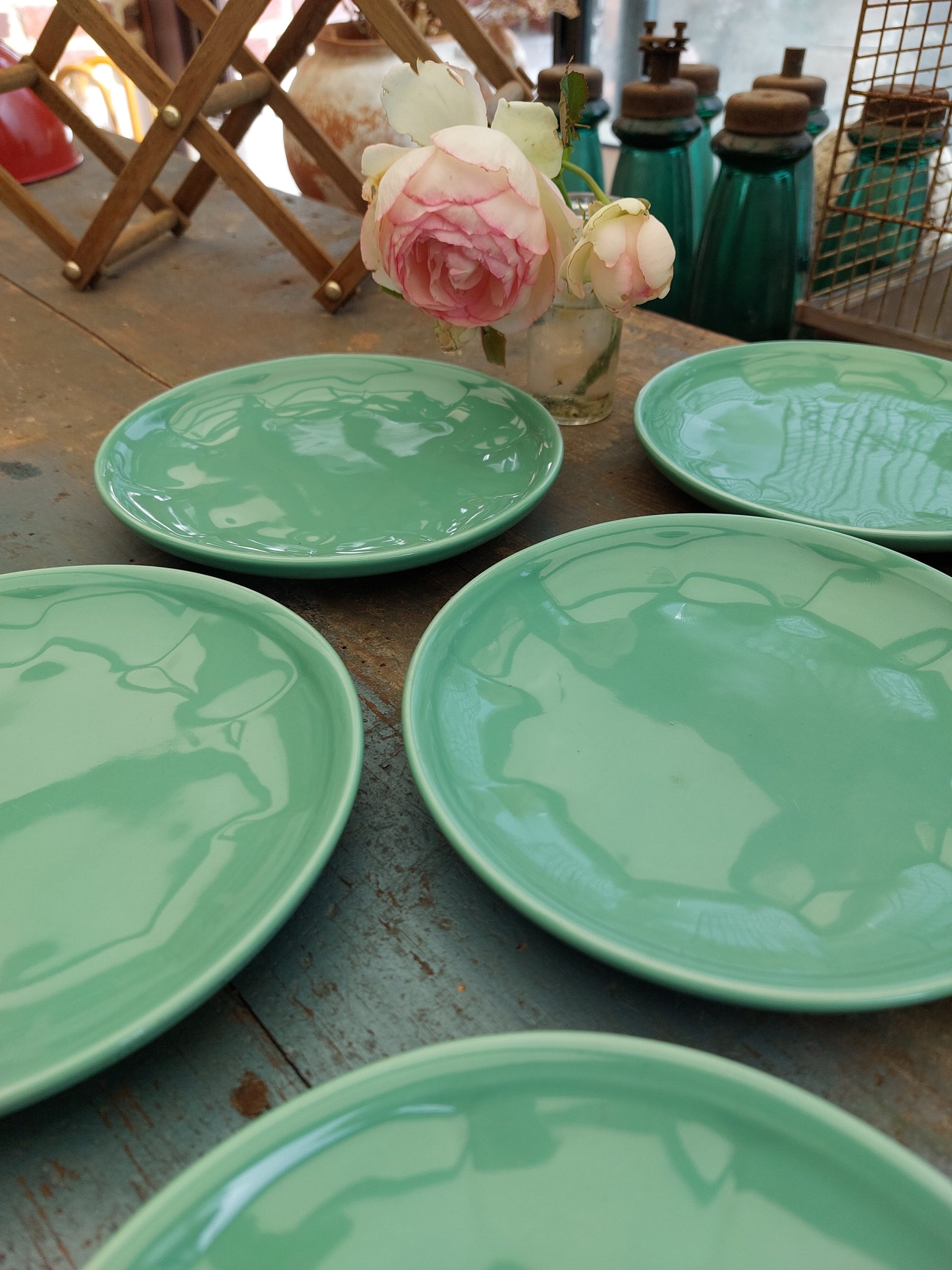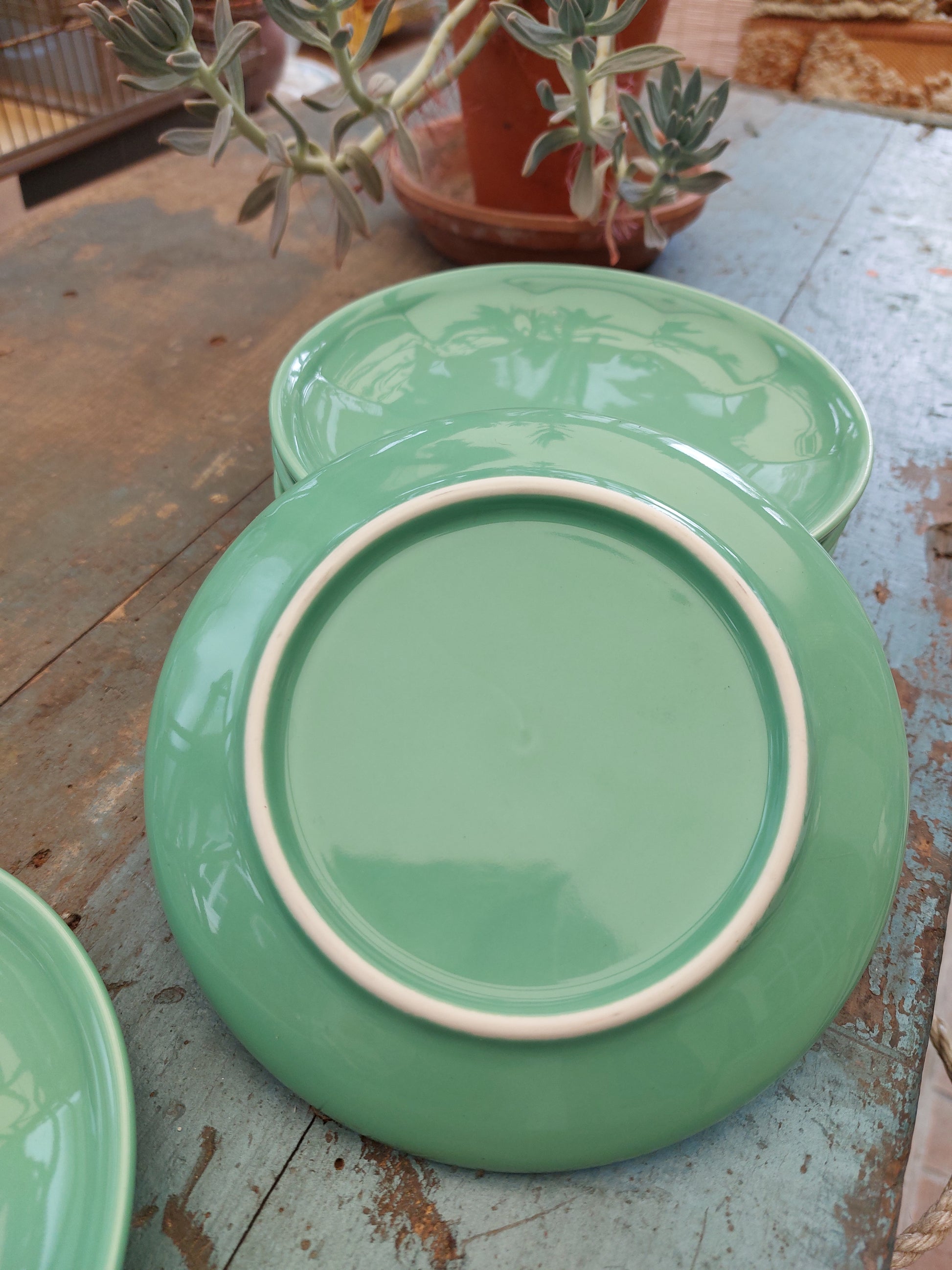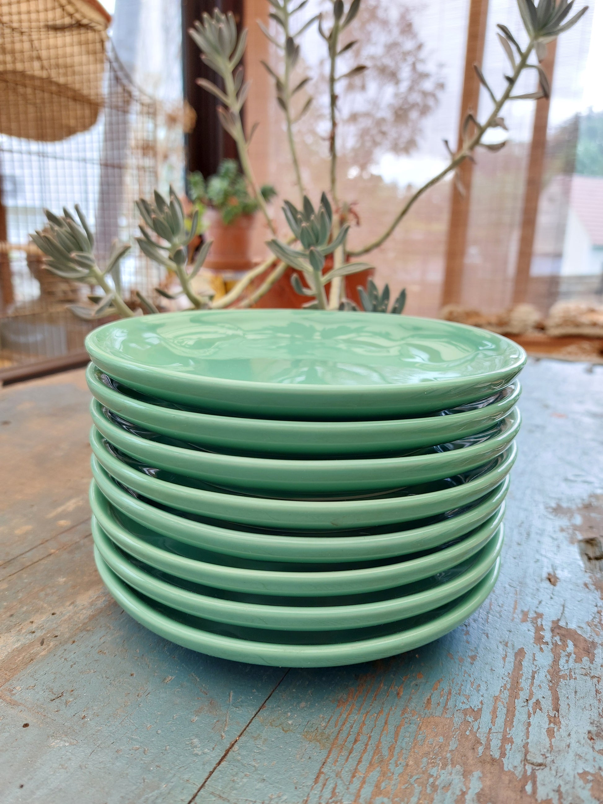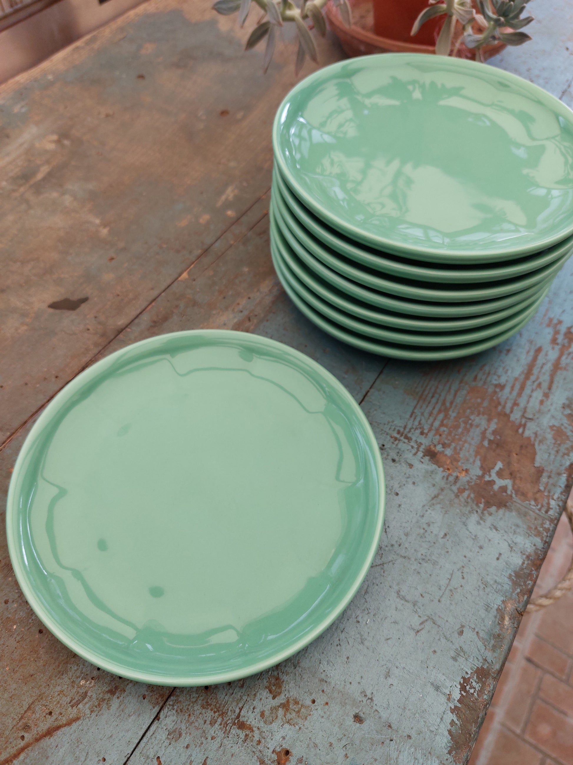 Lot de 8 assiettes à dessert en céramique émaillée de couleur vert tendre en excellent état. Le modèle s’inspire des soucoupes de tasse à café bistrot. Elles peuvent parfaitement compléter un service de table blanc, fleuri ou pastel !