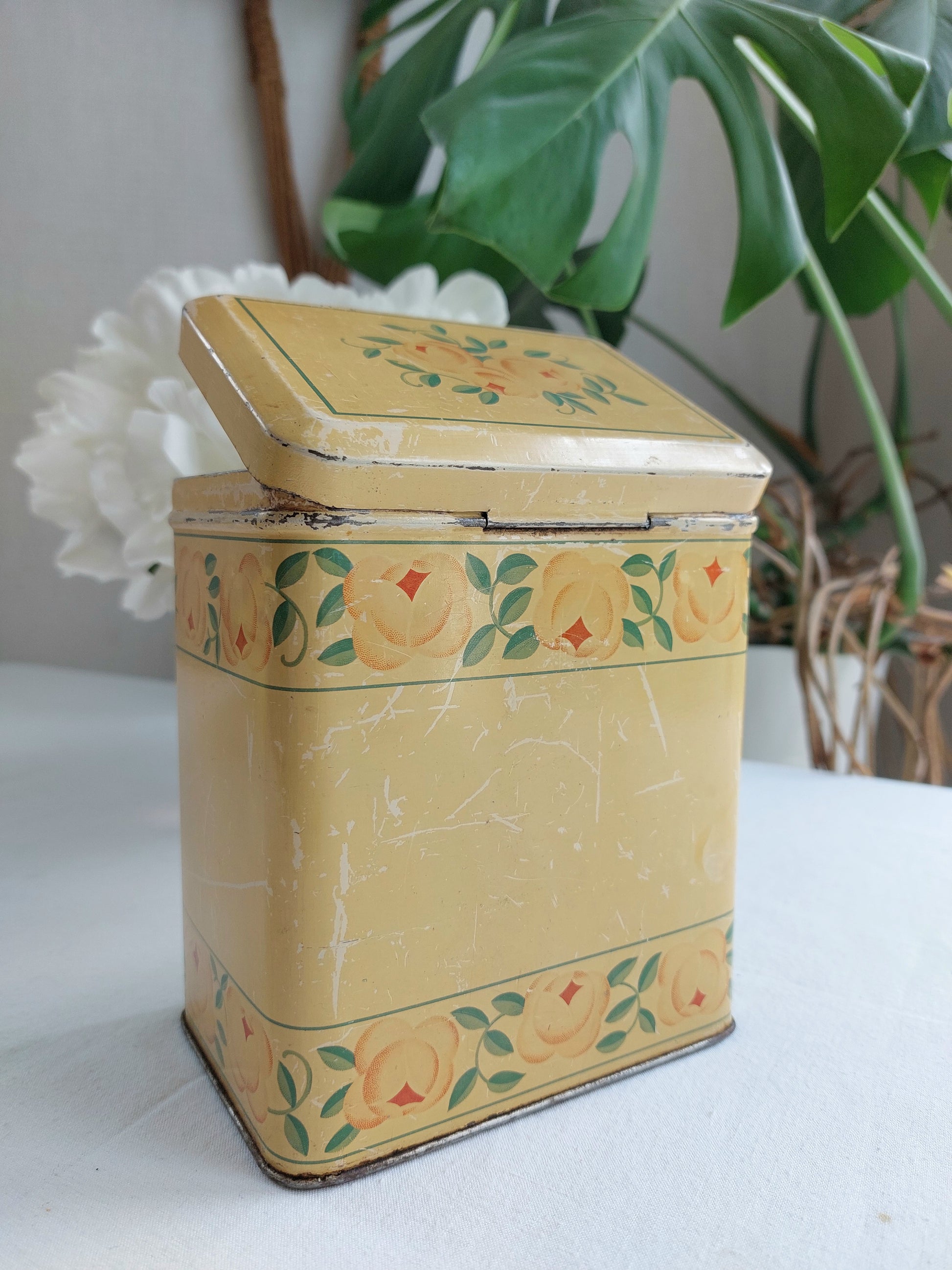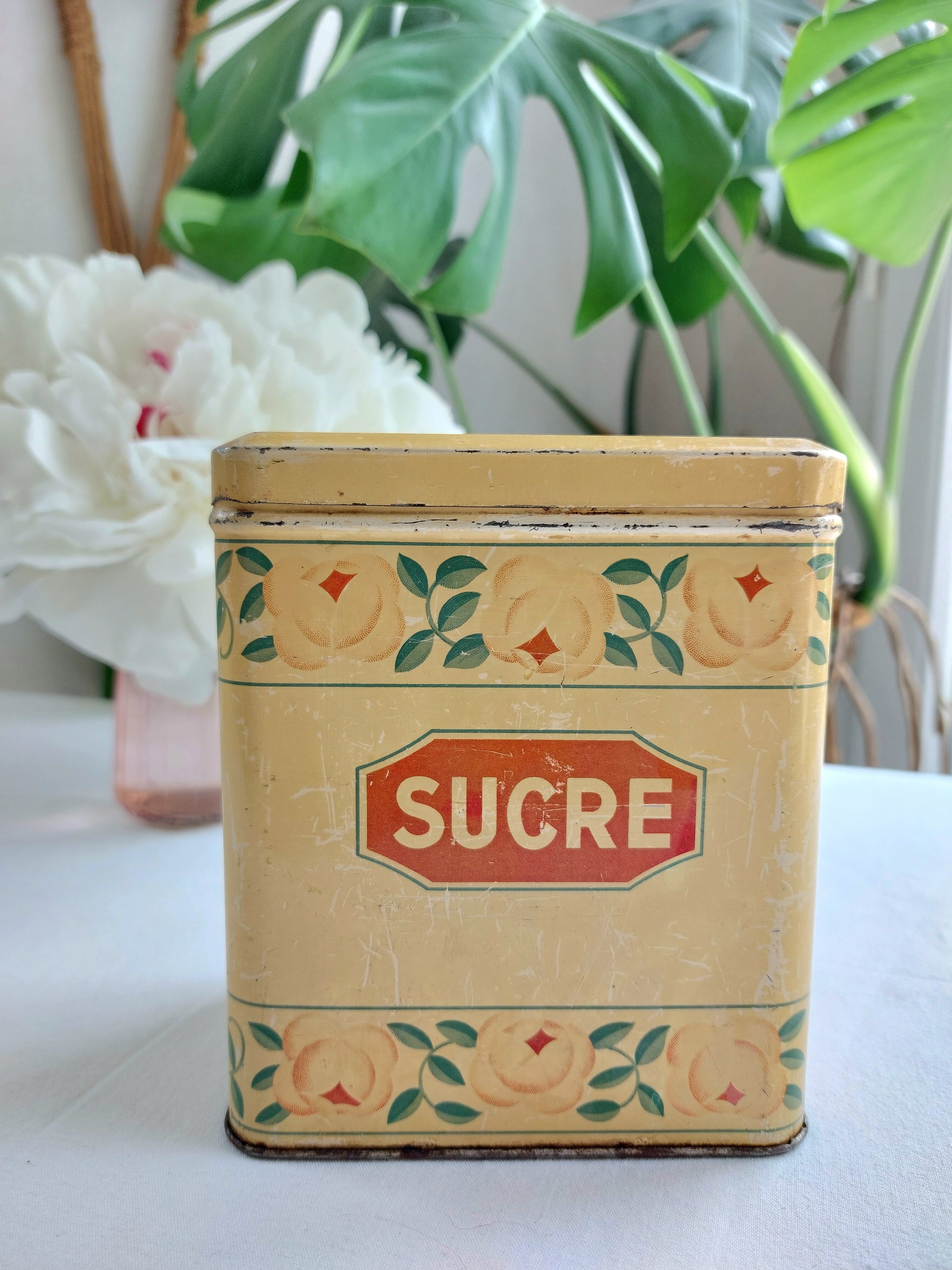Boîte ancienne en métal de couleur crème jaune à décor de fleurs portant une étiquette authentique Menier. Elle porte l’inscription « sucre ». Traces d’usure visibles sur les photos. Patine idéale pour une déco de charme dans un esprit maison de campagne !