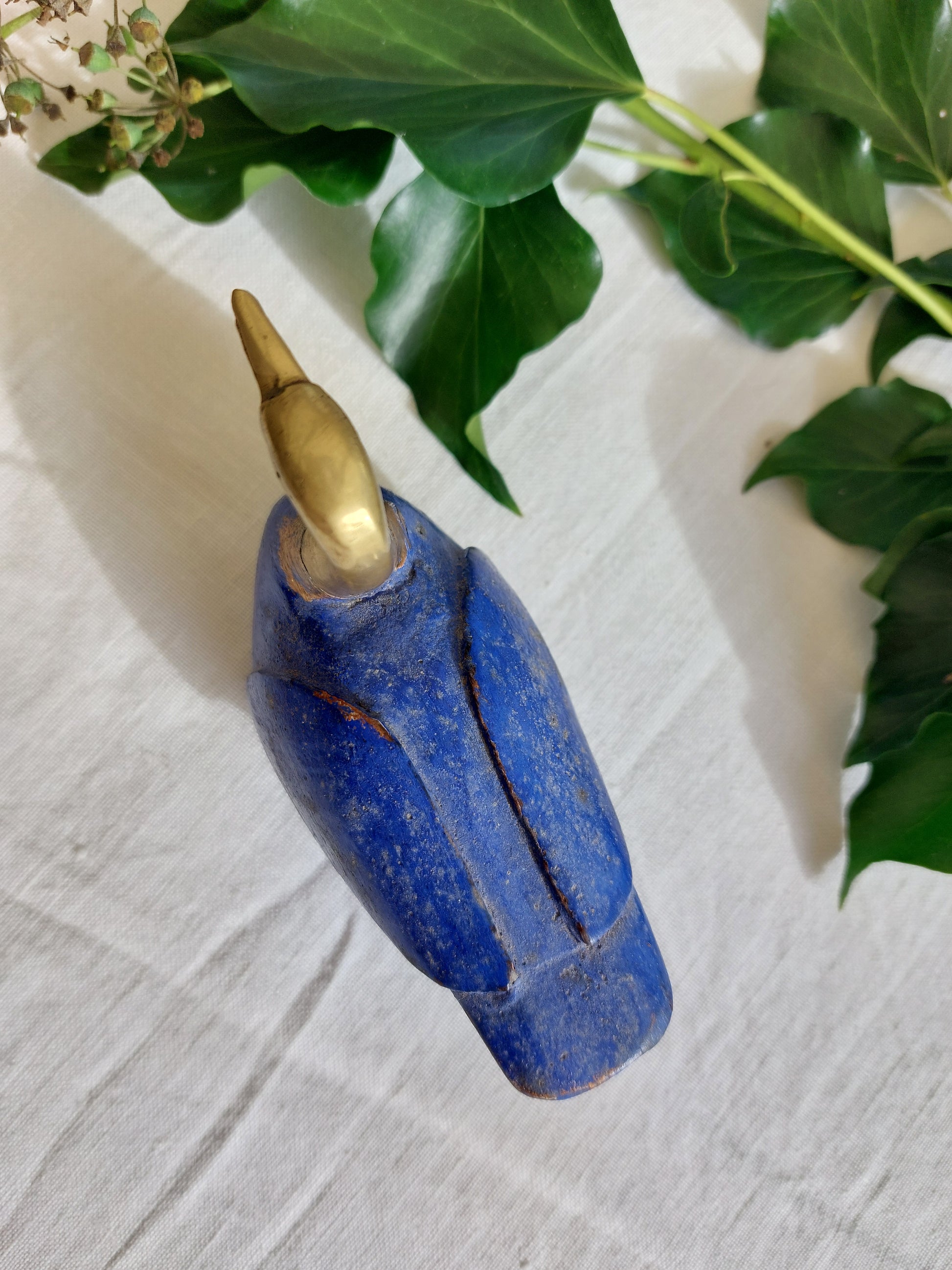 Je trouve ce petit canard peint en bleu roi très décoratif. Il est en bois sculpté et possède une tête en laiton. On observe quelques manques au niveau de la peinture ce qui lui donne un aspect patiné vieilli ravissant. Une idée cadeau pour les fêtes !