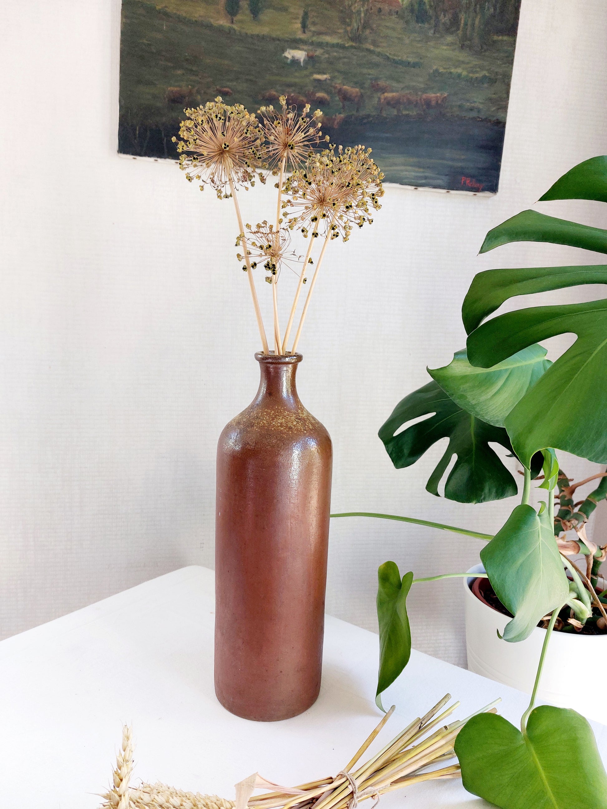 Elle peut être détournée en soliflore avec quelques tiges de fleurs séchées sur une commode en bois brut ou en objet de collection. Elle s’intègrera aussi bien dans un intérieur de style maison de campagne que dans un intérieur plus minimaliste ou wabi-sabi ! Un cheveu ou une légère fêle à l’intérieur du goulot.