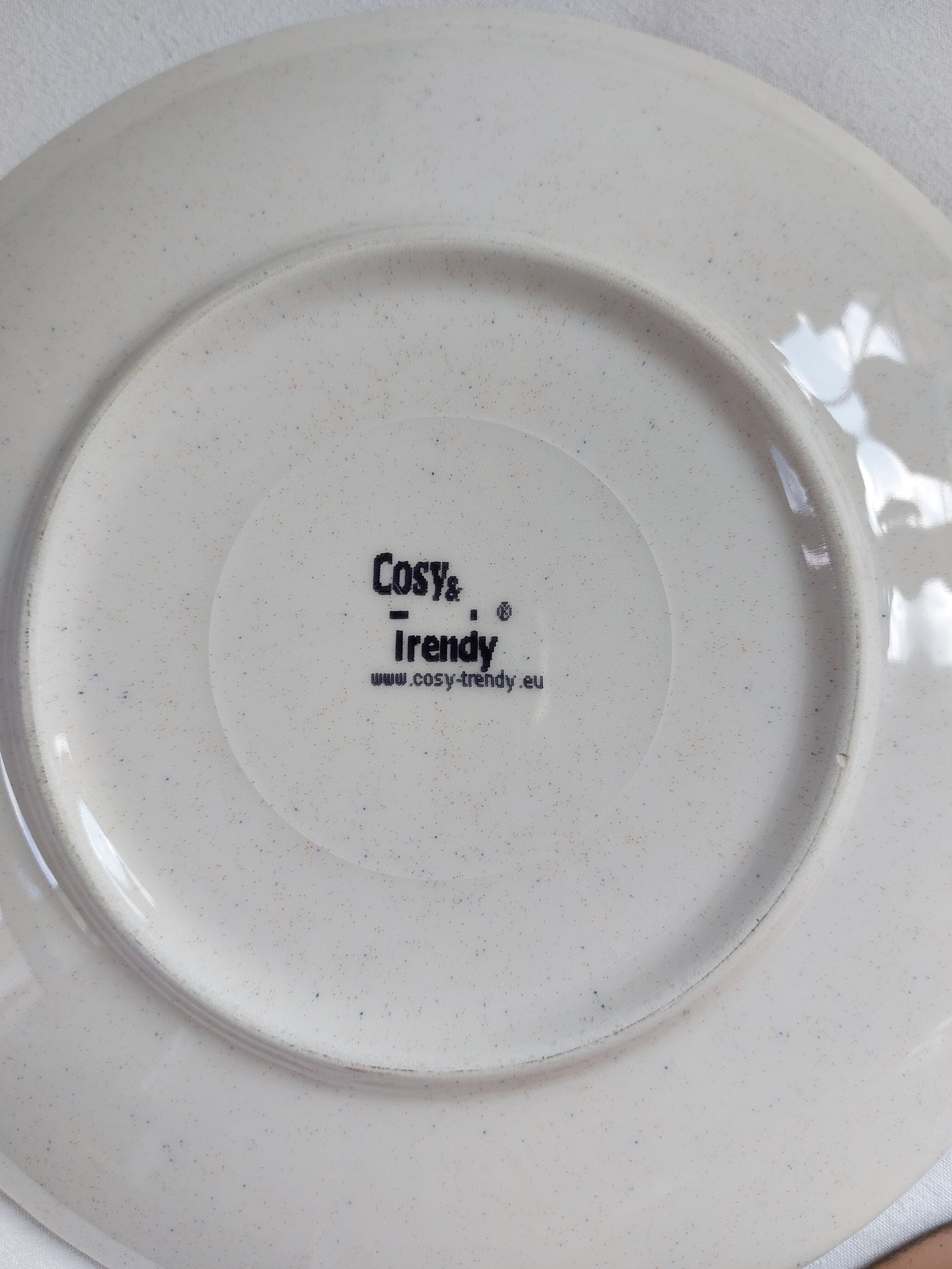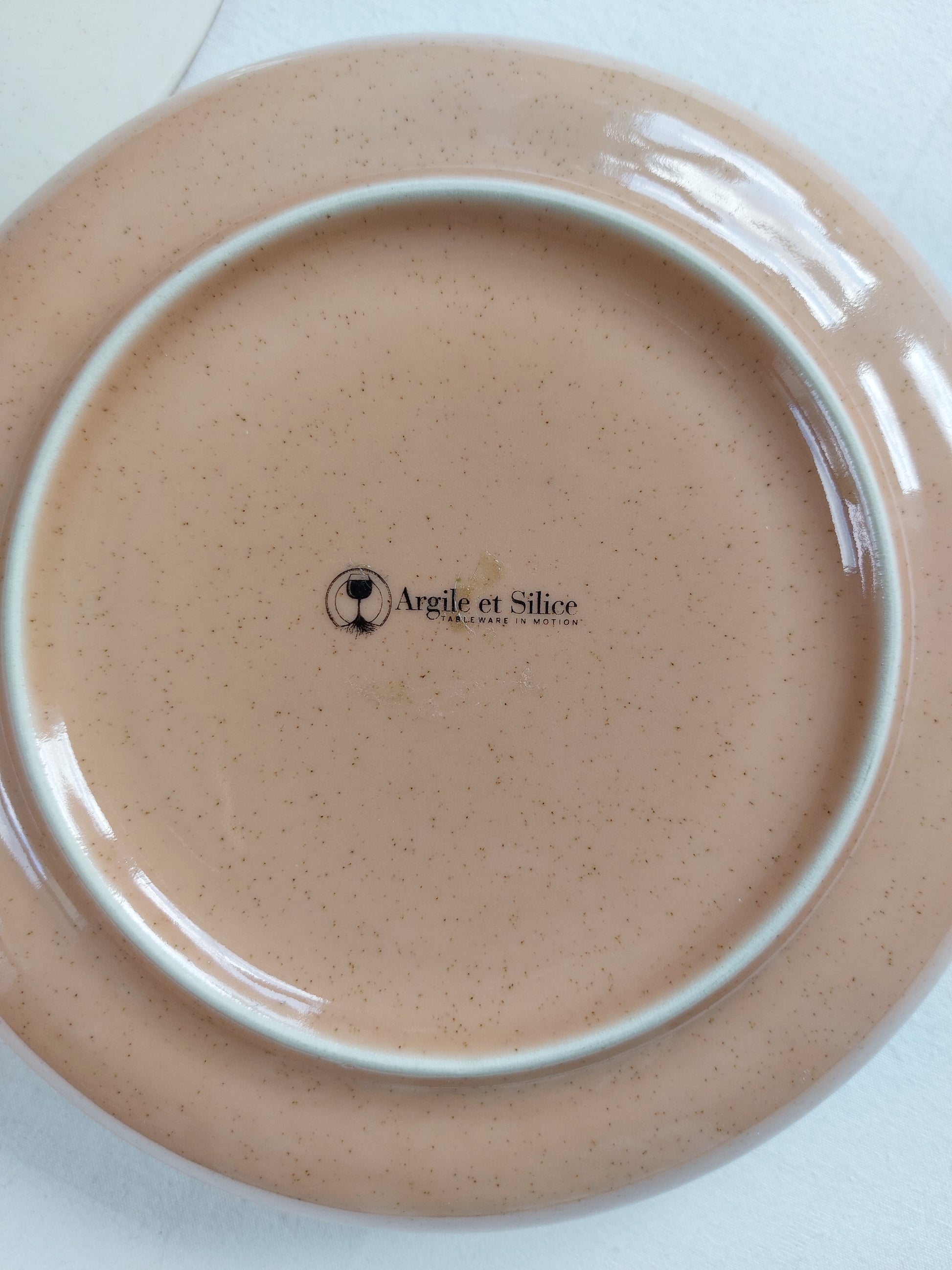 Ensemble de 2 assiettes en céramique composé d’une assiette creuse de couleur saumon clair et d’une assiette plate dans les tons rose. Les 2 assiettes sont tachetées de points bruns et possèdent des bords de couleur brune. Elles peuvent utilisées pour le service ou assorties avec d’autres modèles en grès ou dans les tons naturels. Style bohème. Elles sont en très bon état.