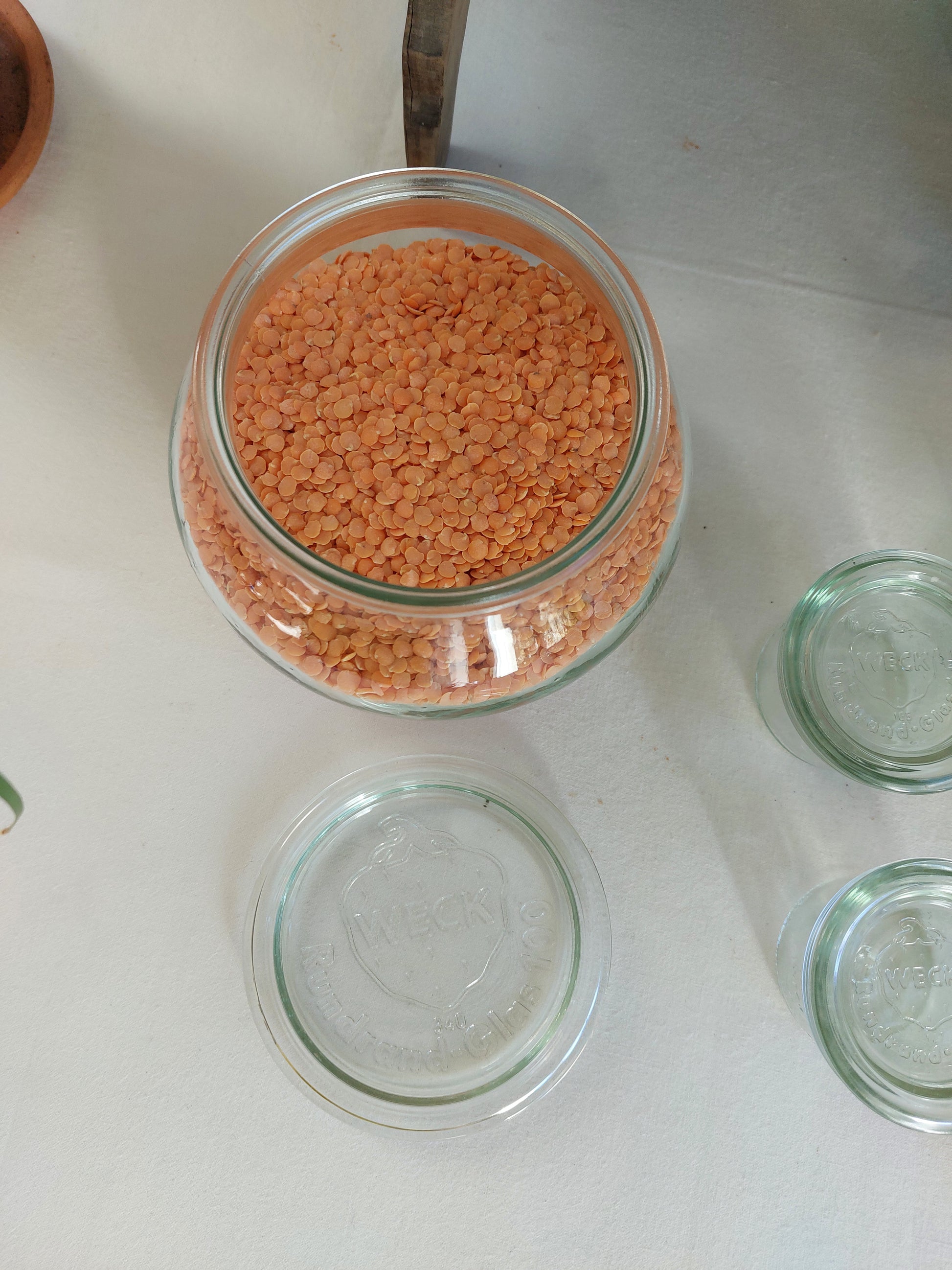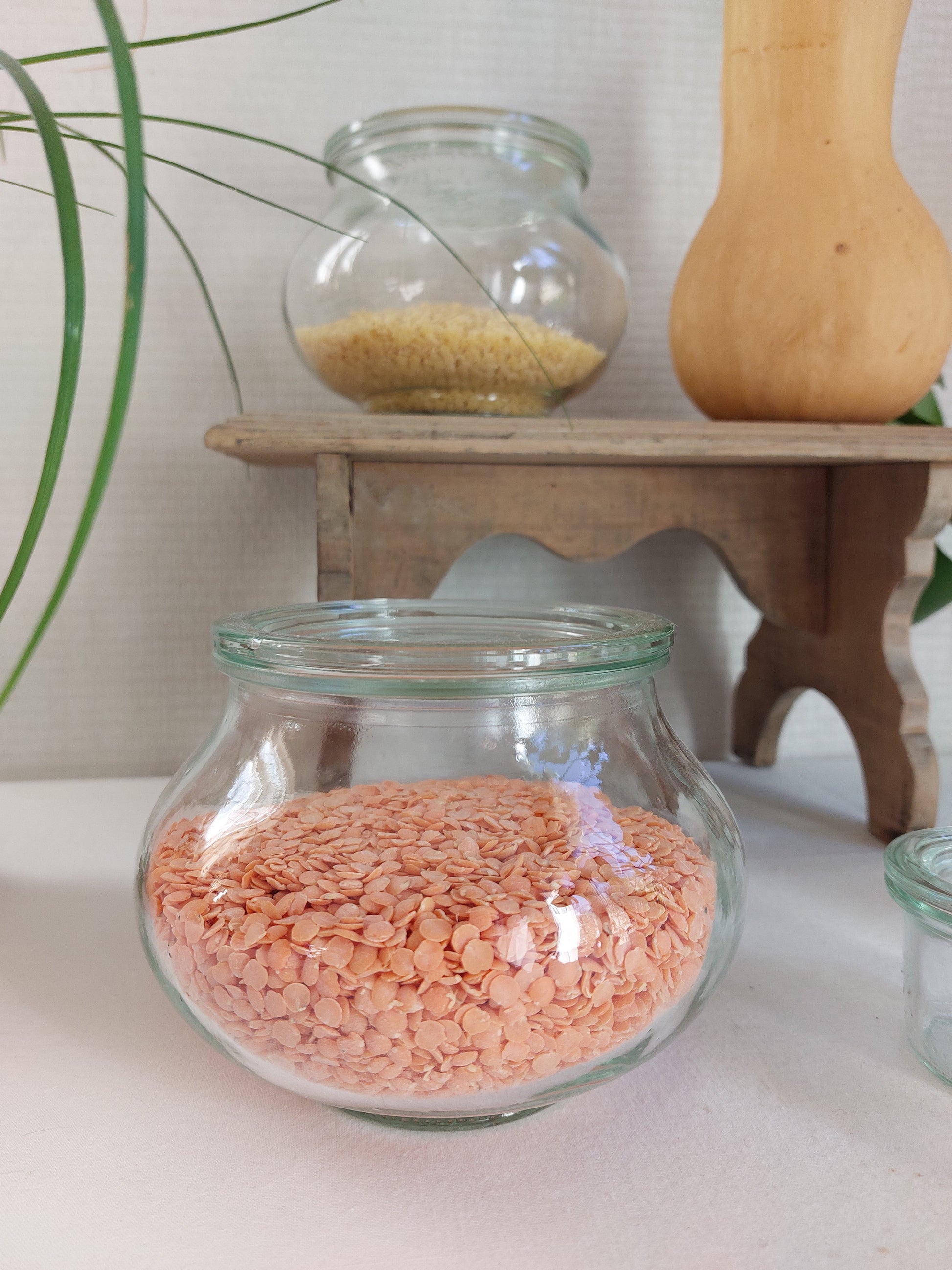 Lot de 2 bocaux WECK d’une contenance d’1L en parfait état. Il s’agit d’une marque allemande datant du début du XXème siècle aujourd’hui localisée en Belgique. Leur design est authentique et vintage. Pour conserver vos légumes et fruits secs dans votre cuisine pour un style maison de campagne. Ne les cacher surtout pas dans un placard !