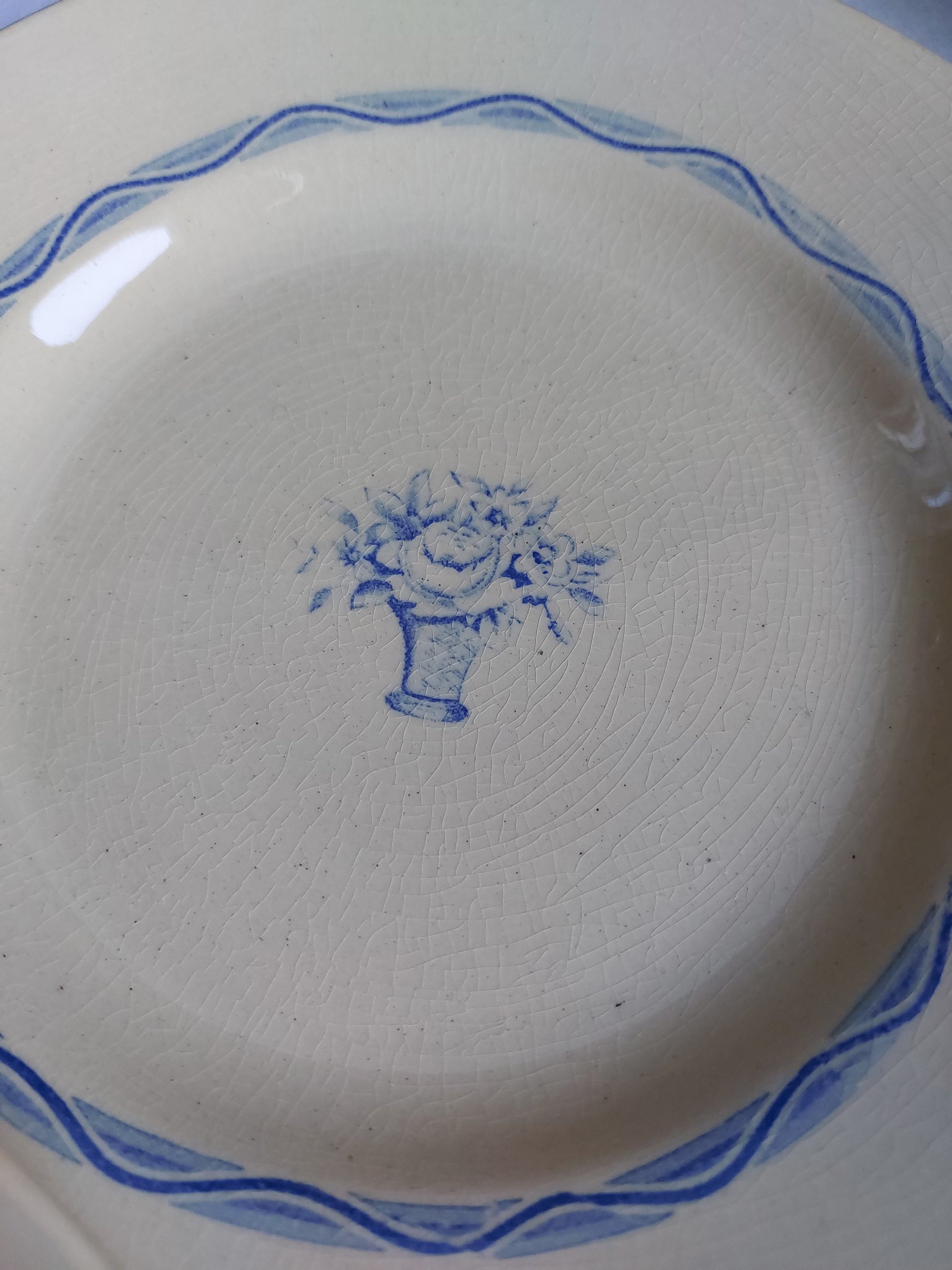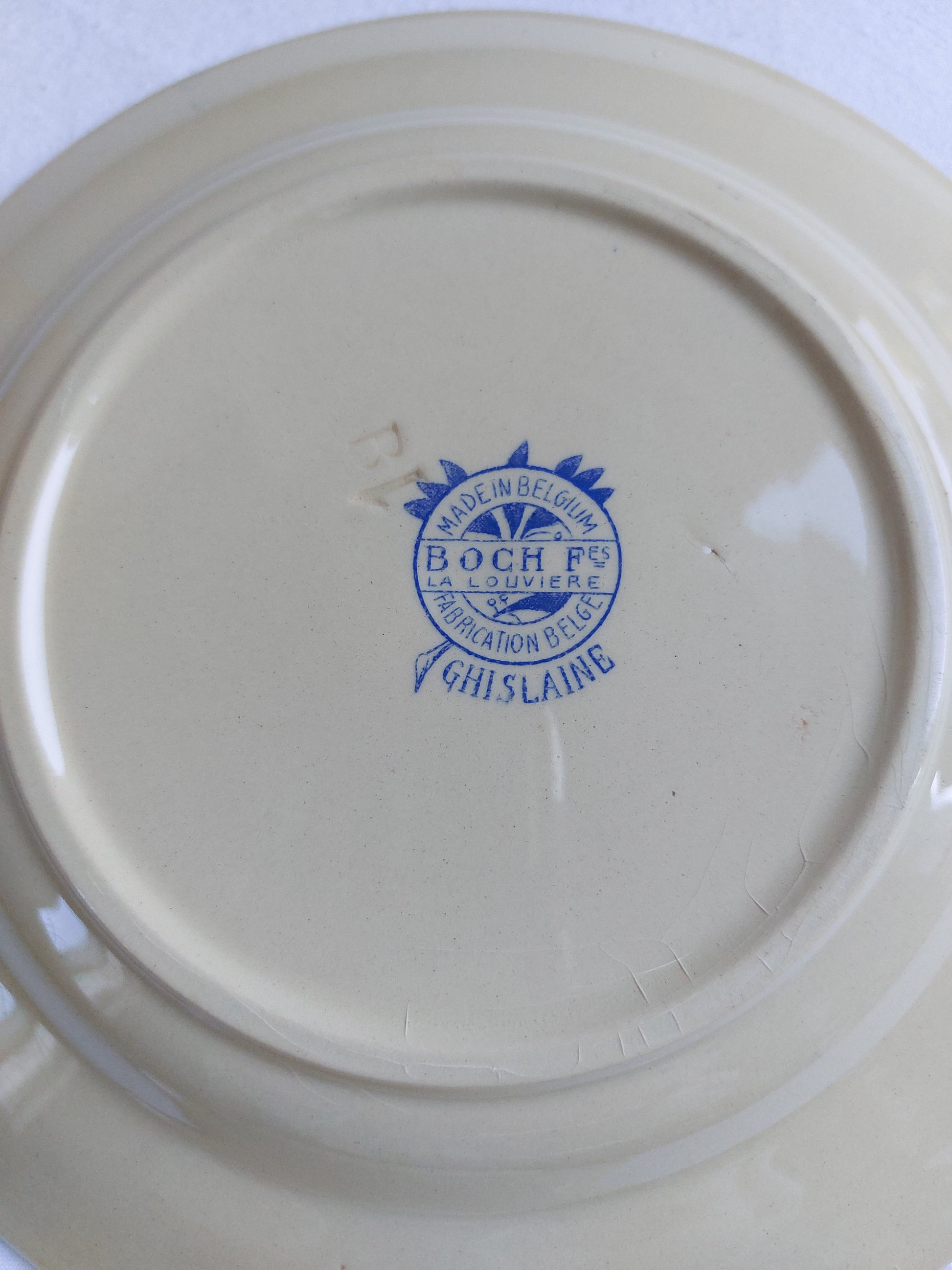 Lot de 6 assiettes à dessert anciennes estampillées BOCH Frères La Louvière de fabrication belge en bon état. Il s'agit du modèle "GHISLAINE". Elles sont de couleur crème et ornées d’un motif bleu sur le contour et d’un bouquet dans un vase au centre. Certaines assiettes présentent des craquelures ou de petits défauts sur les bords mais cela vient des étapes de fabrication. Pour accorder avec un service ancien dans les tons bleus dans un style maison de famille à la campagne.