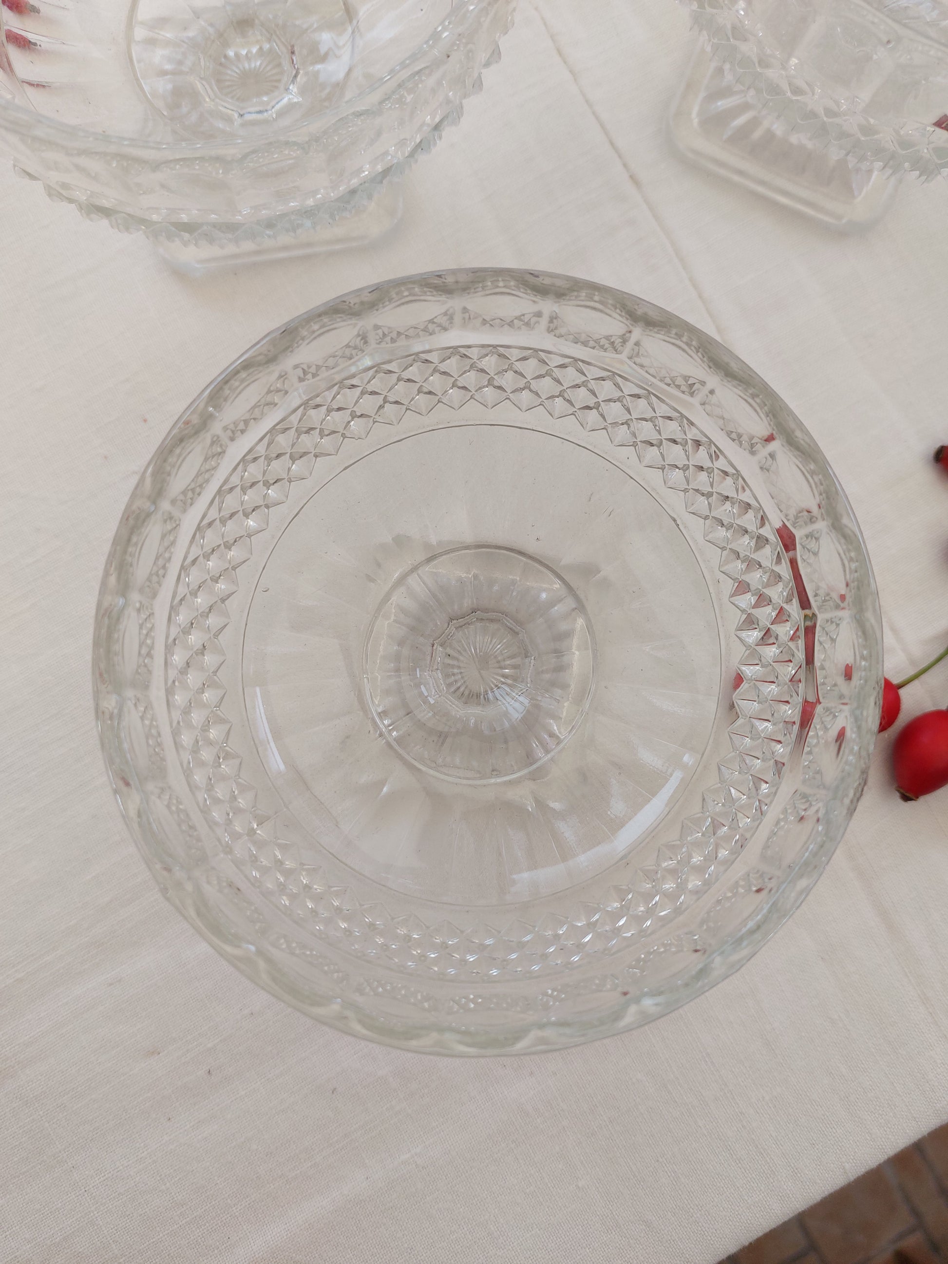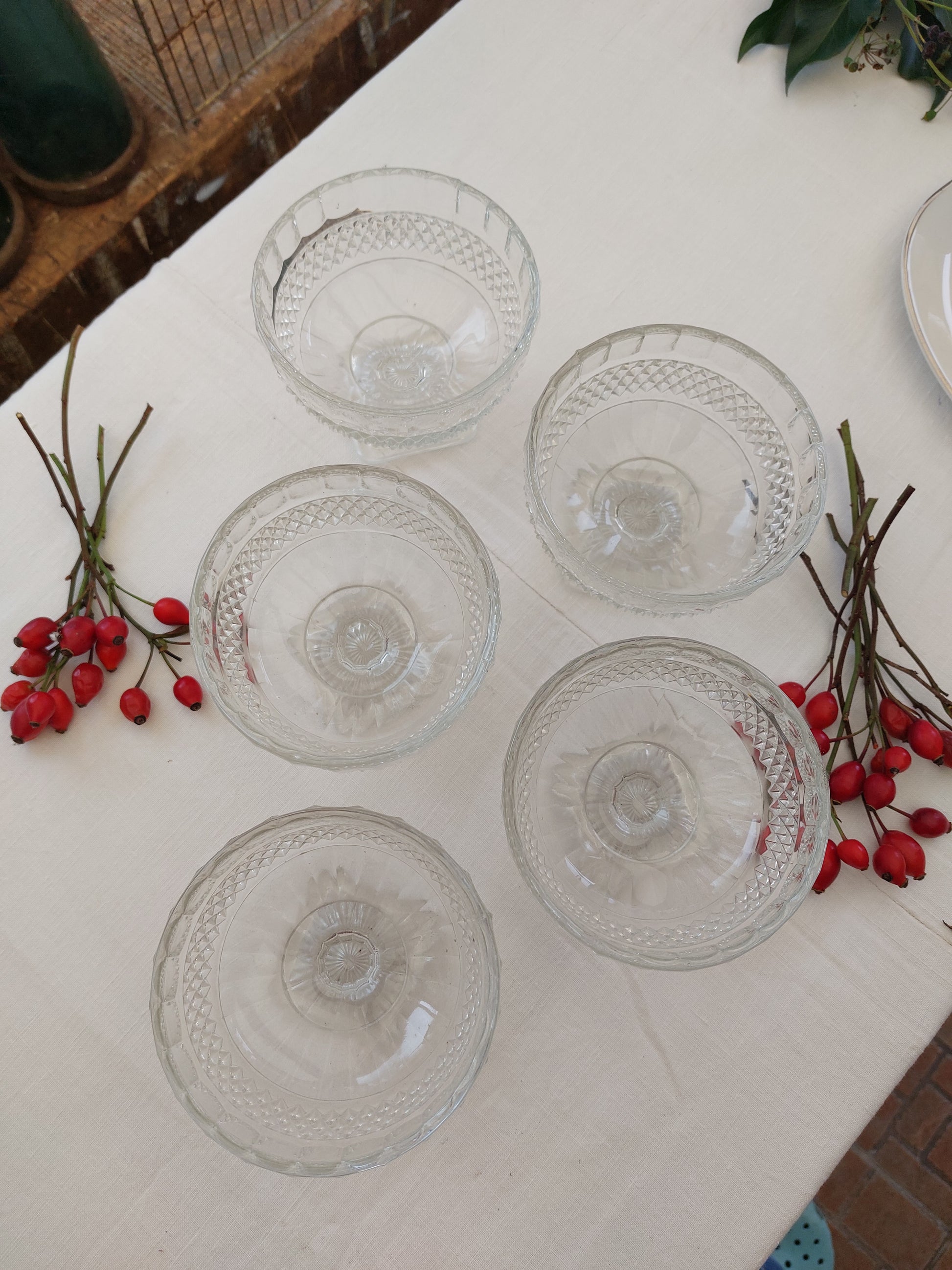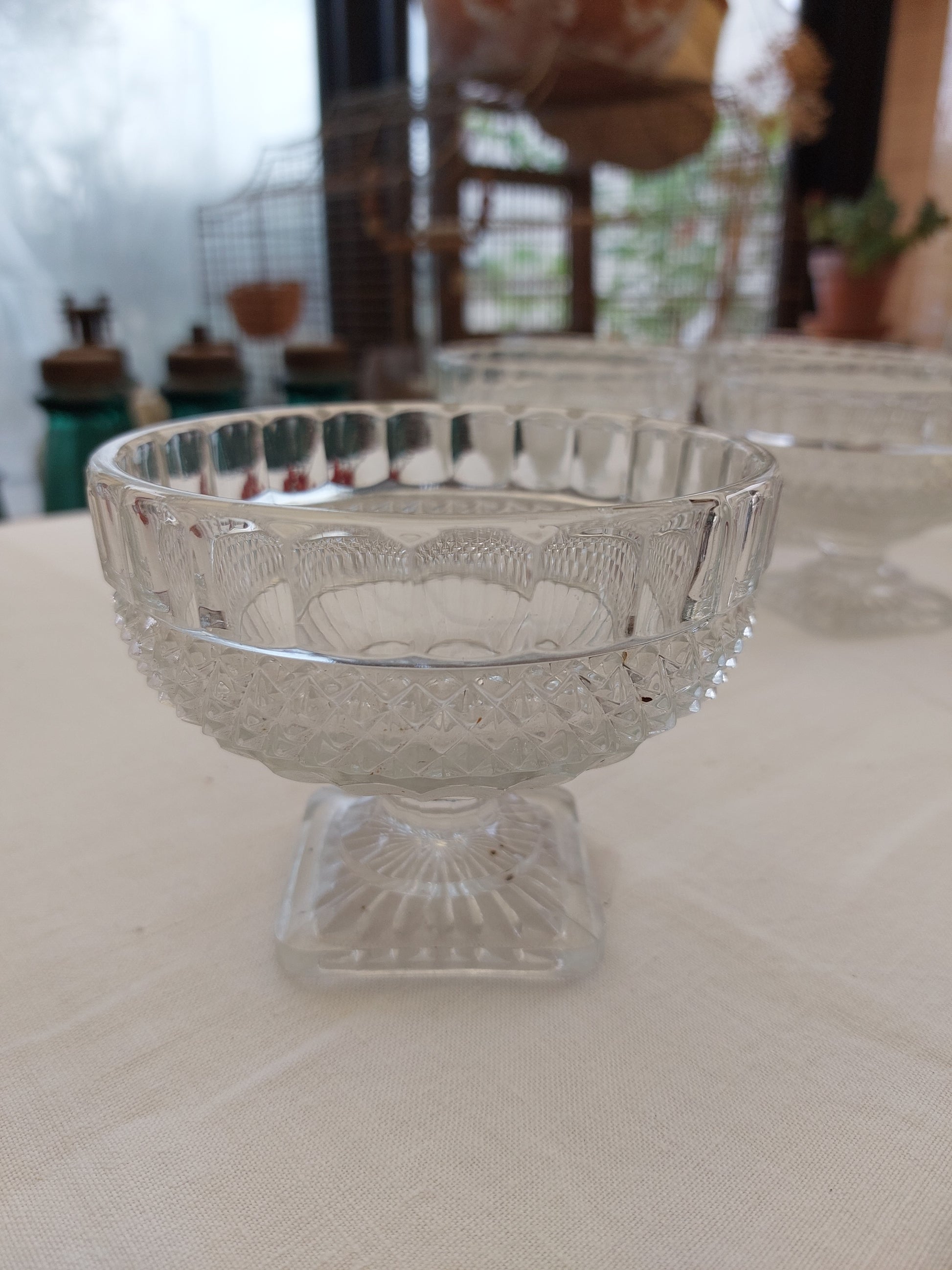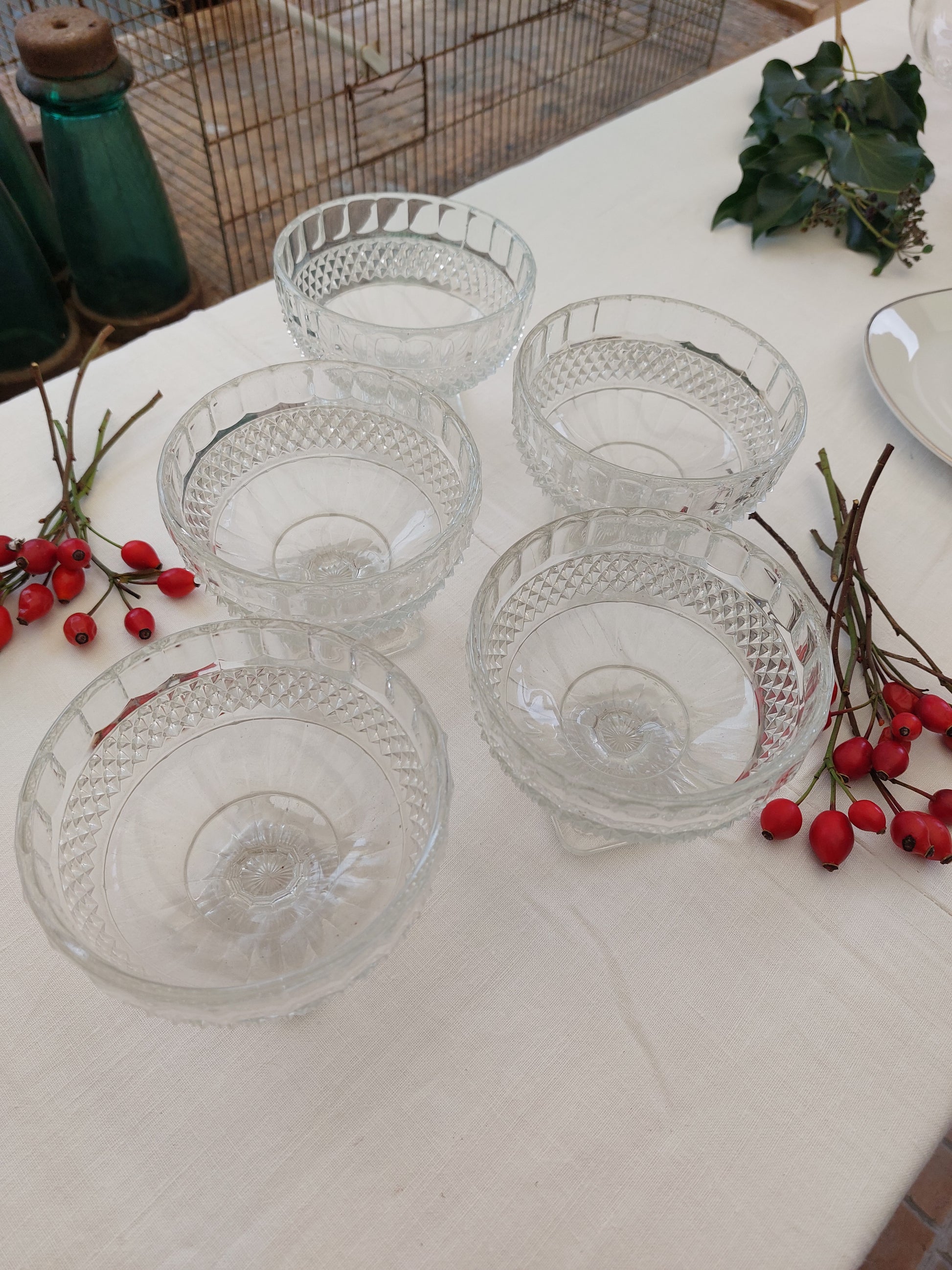 Joli lot de 5 coupelles sur pied en verre moulé au motif de pointe de diamant. Elles sont en très bon état sans fêle ni brèche. Un défaut dans la fabrication est visible si on les aligne, il s’agit d’une légère inclinaison au niveau du pied sur l’un des coupes.