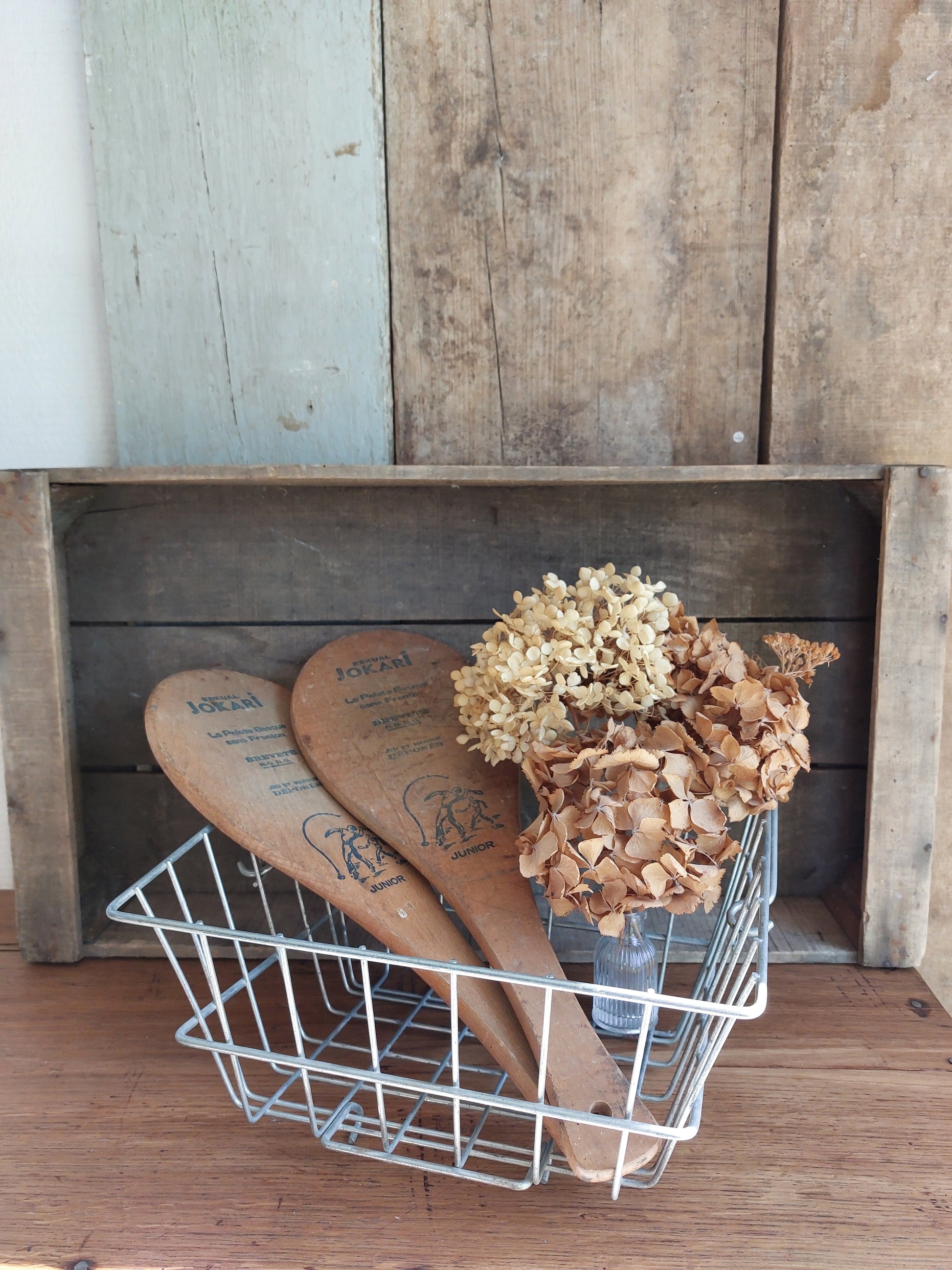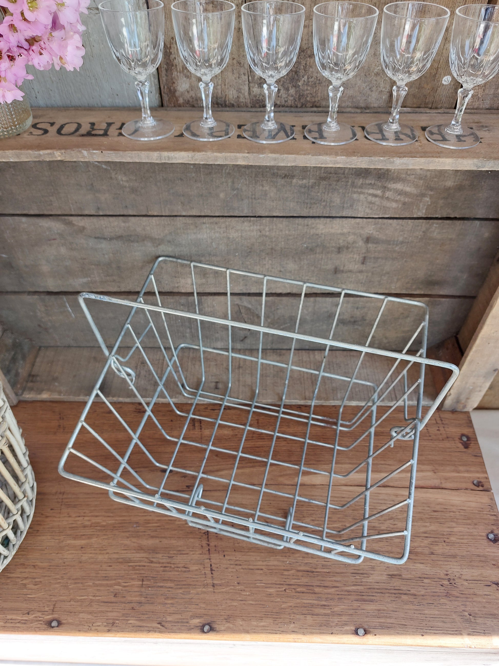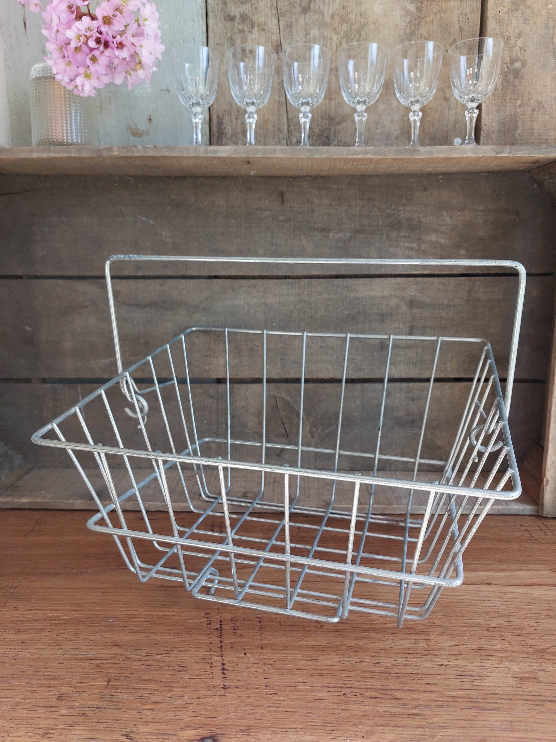 Panier en métal grillagé avec anse de transport. Je ne trouve pas l’utilisation première de ce panier mais son style industriel est très décoratif en fait un objet de déco sympa. Facilement utilisable pour le stockage de fruits et légumes, revues, pelotes de laine… et vous qu’allez-vous en faire ?