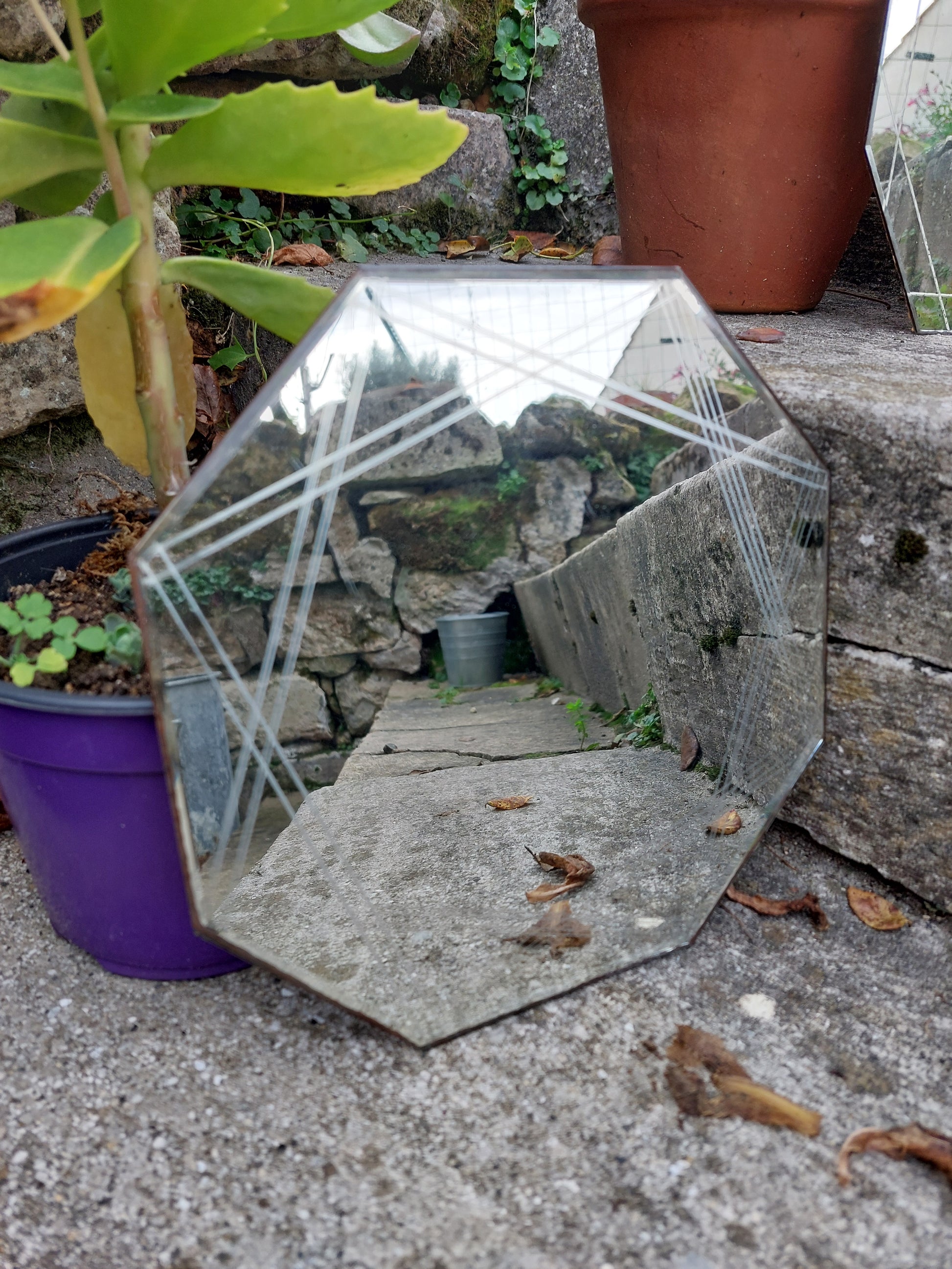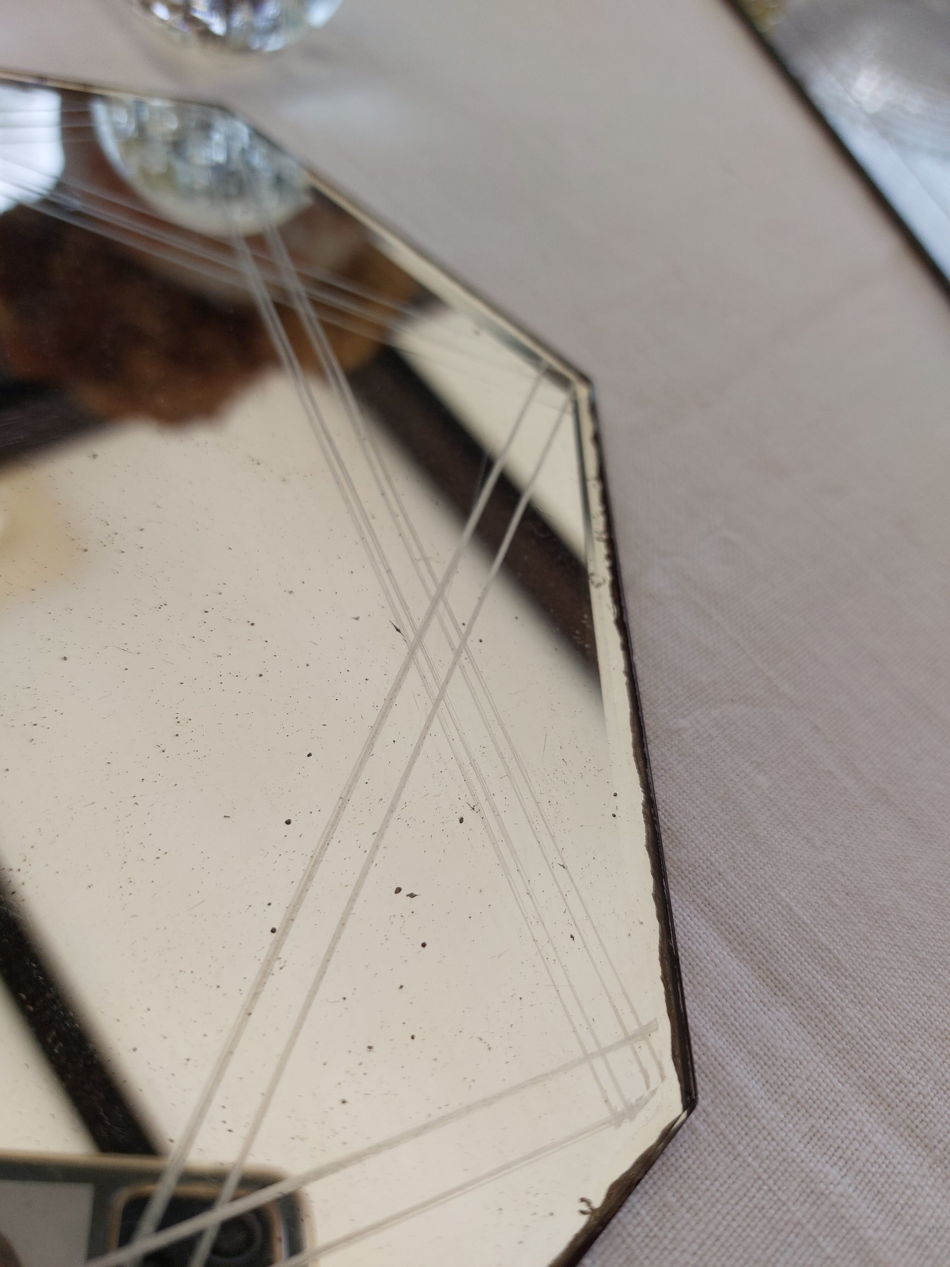 Petit miroir ancien de forme octogonale et biseauté. Son décor géométrique se compose de lignes parallèles qui s’entrecroisent. Il est très légèrement piqué ce qui lui apporte de l'authenticité et du charme !