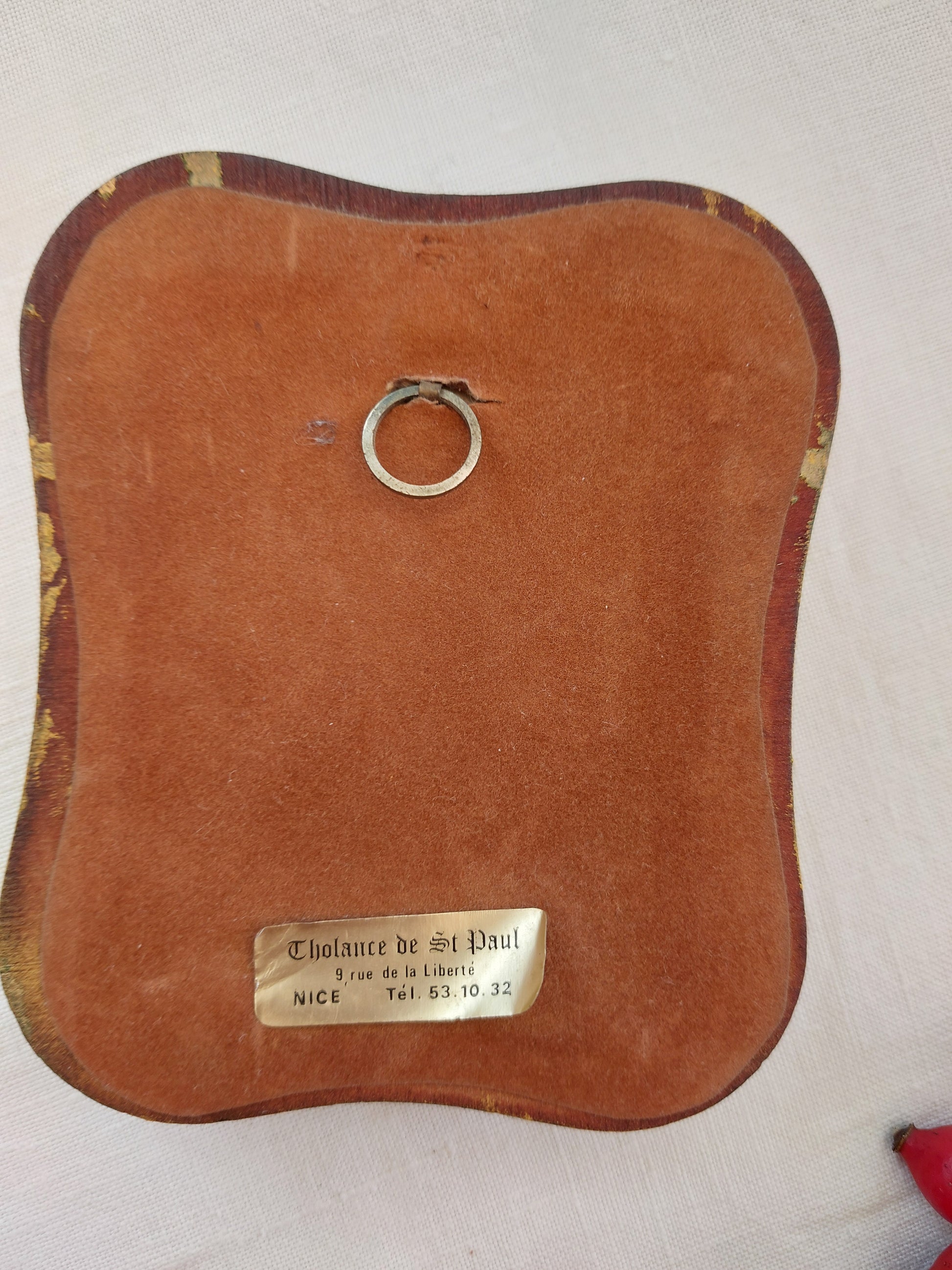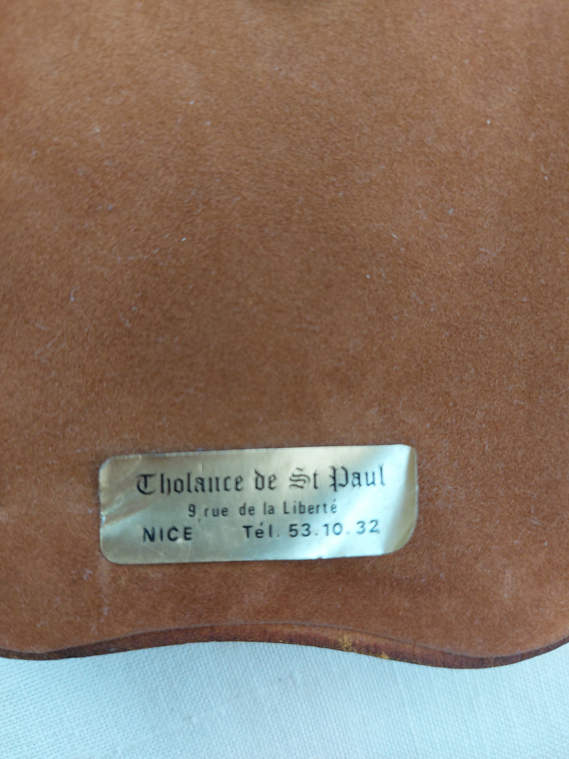 Jolie petite toile représentant un ravissant bouquet de fleurs dans un vase. La composition est très raffinée et délicate compte tenu de la toute petite taille de la toile. L’encadrement d’origine est aussi très bien réalisé. Le sujet est signé FI.TH. et porte une étiquette au dos du tableau précisant la provenance de Tholance de St Paul qui est un célèbre atelier situé à St Paul de Vence. Ce petit sujet pourrait compléter une accumulation de petites toiles. Toile de belle facture et cadre joliment patiné. Excellent état.