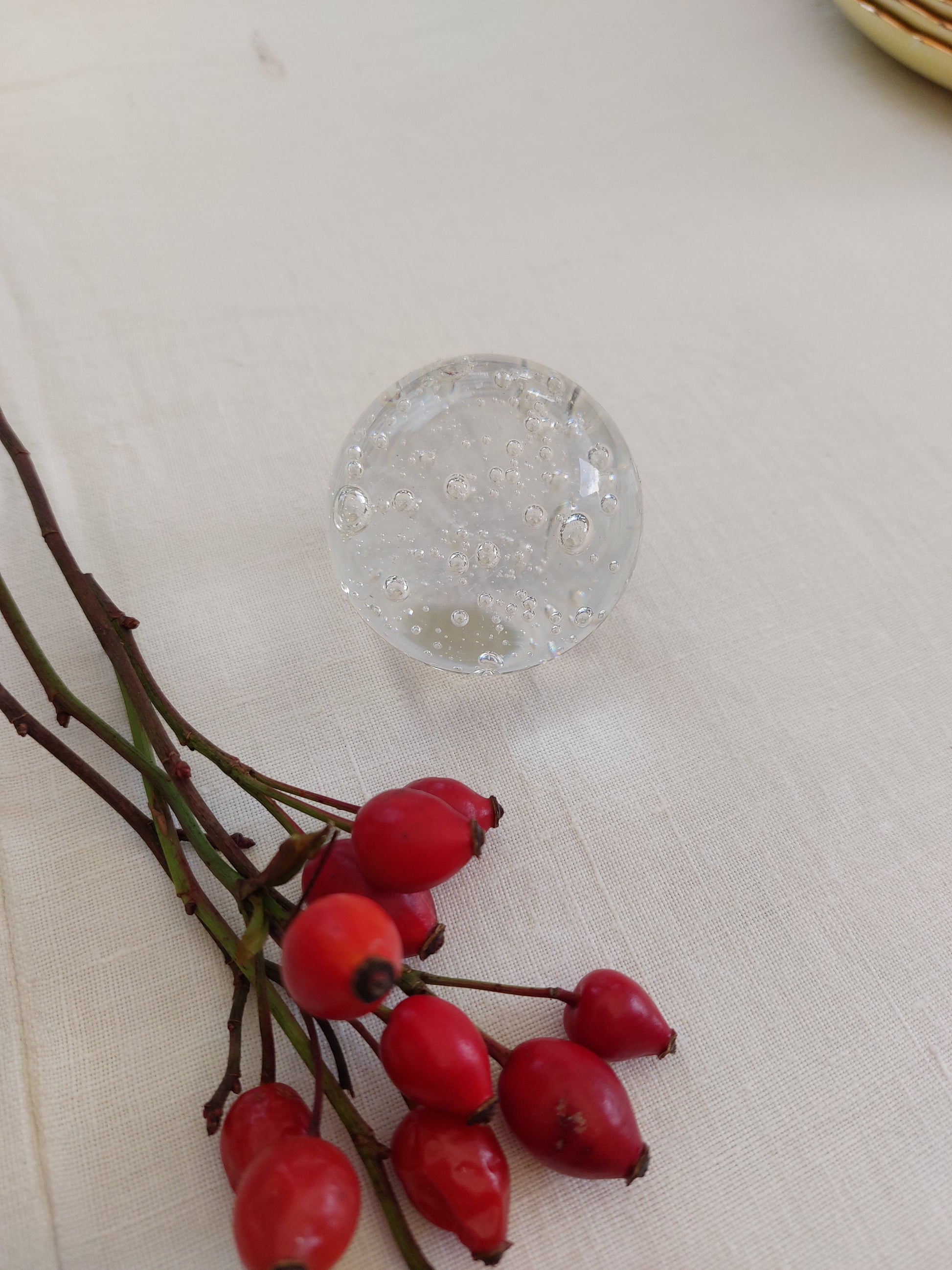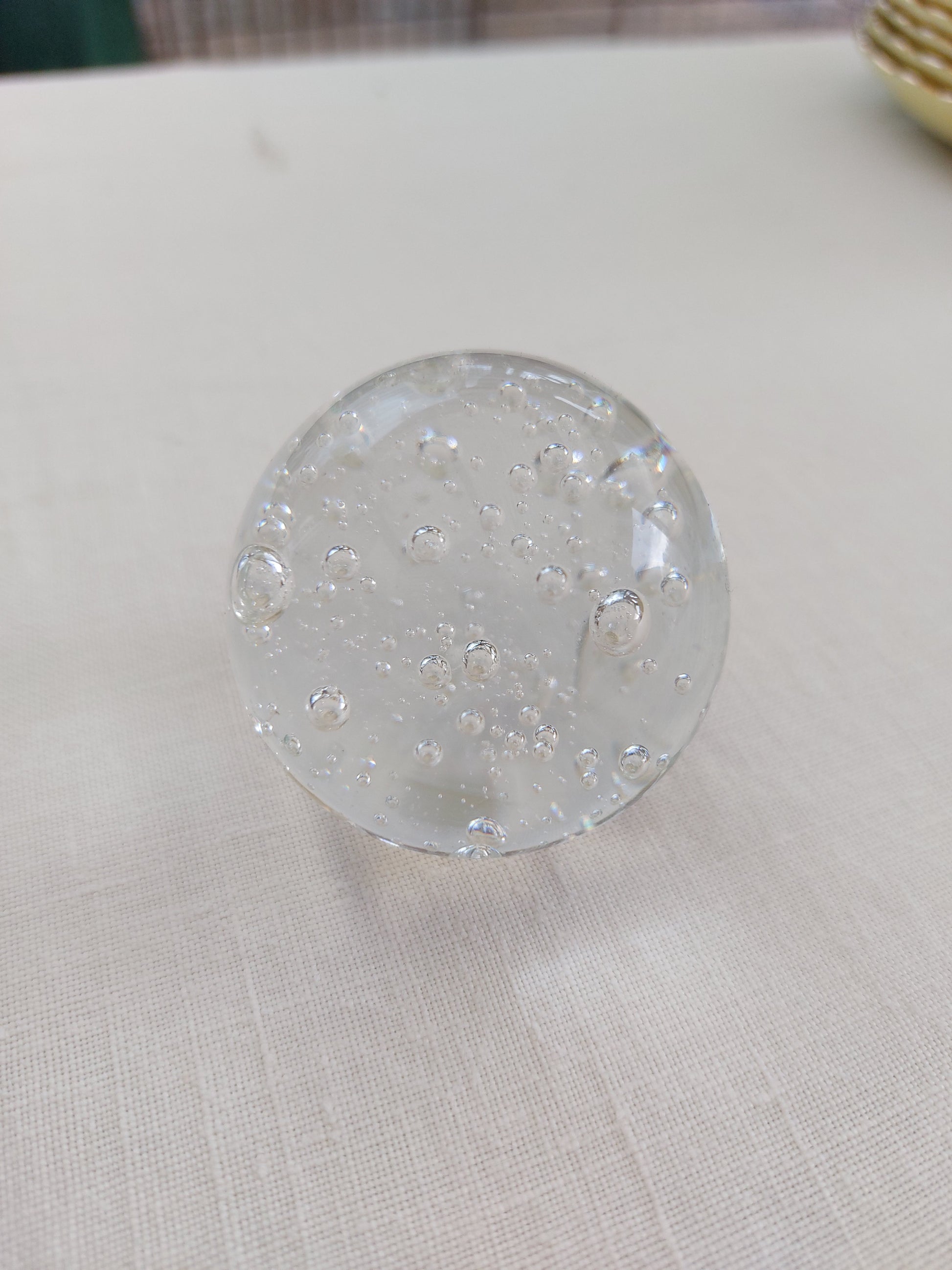 Jolie sulfure en verre incrustée de bulles translucides. En accumulation sur une commode ou un joli plateau ou en presse papier sur un bureau, ce petit sulfure de 5cm de diamètre peut aussi être l’objet d’un petit cadeau !