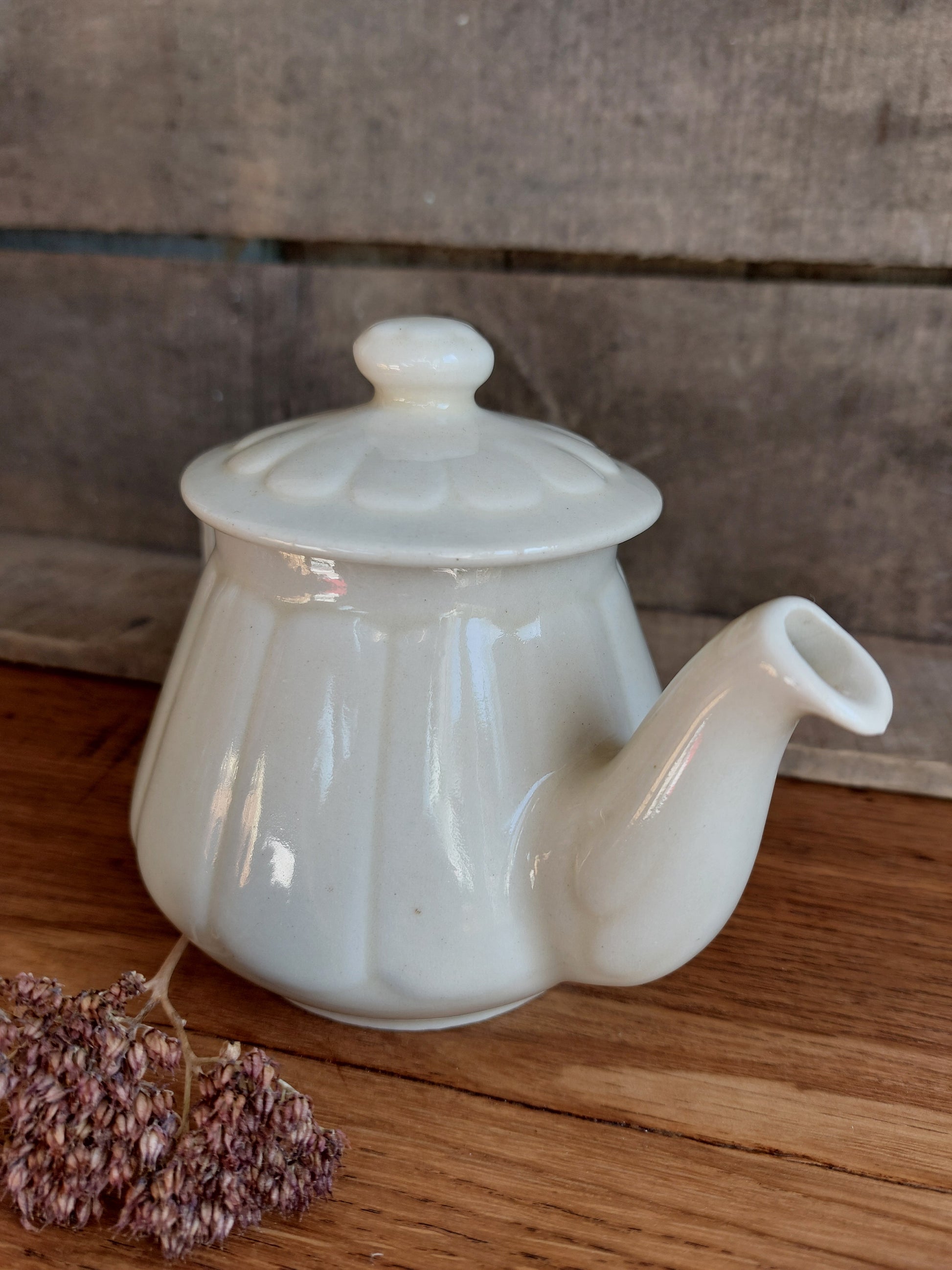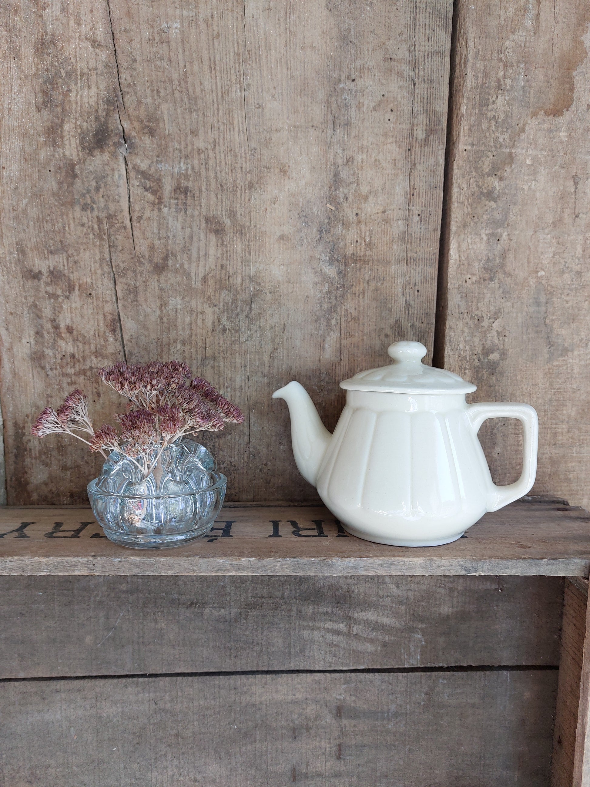 Jolie petite théière ancienne en faïence fine de couleur crème. J’ai déjà chiné ce modèle de taille plus grande et de couleur verte mais celle-ci est ravissante par sa petite taille. Pour votre tea time en solo ou en décoration, elle a beaucoup de charme pour une déco style maison de campagne !