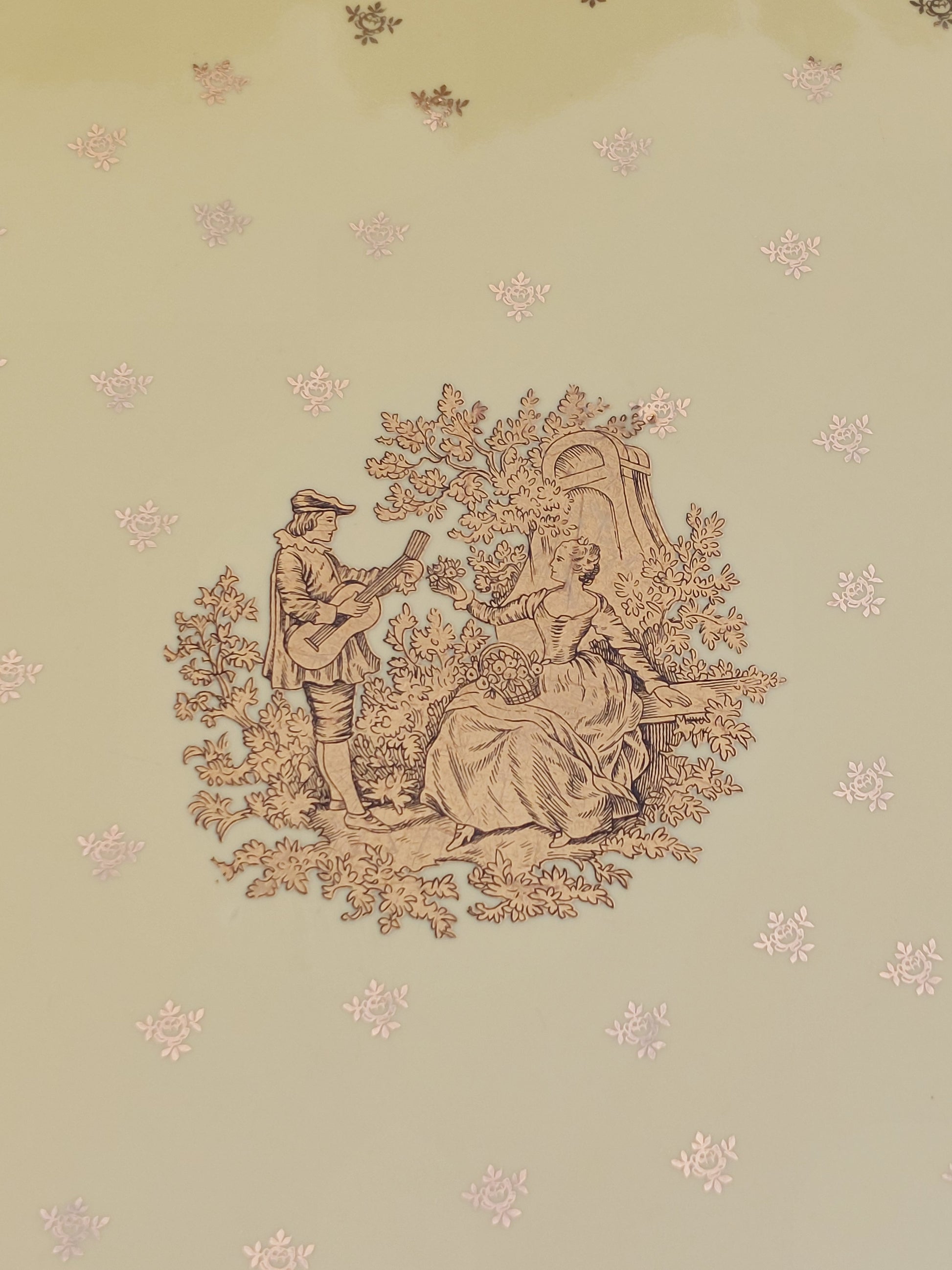 Le décor se compose au centre du plat d’une scène galante typique du XVIIIème siècle avec un jeune musicien debout devant une femme de la Cour assise et l’écoutant. La scène est dorée sur fond jaune. Le contour du plat est doré et orné de décor et de nombreux petits motifs floraux viennent habiller le reste du plat. Il est en très bon état sans éclat ni fêle. La dorure est parfois légèrement altérée probablement dû à son nettoyage. La porcelaine est très brillante et sa couleur très lumineuse. Cette jolie pièce apportera de l'élégance dans un style maison de famille!
