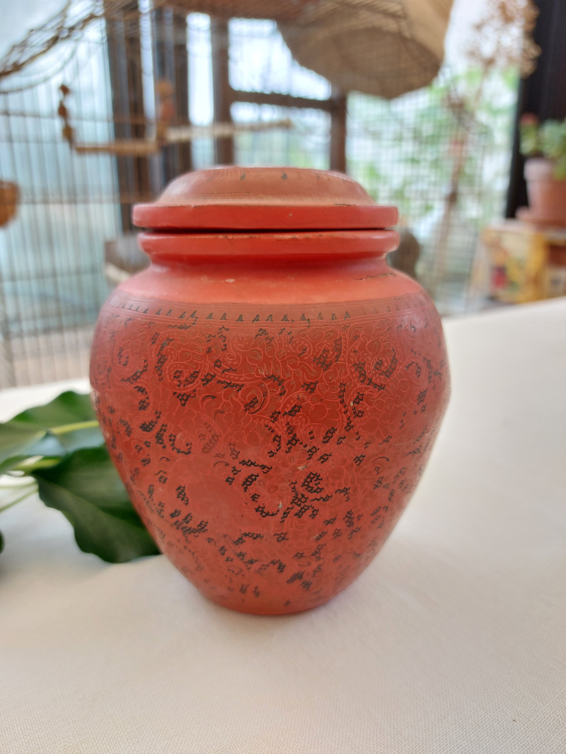 Joli pot à gingembre en bambou laqué et peint sur un fond vermillon.