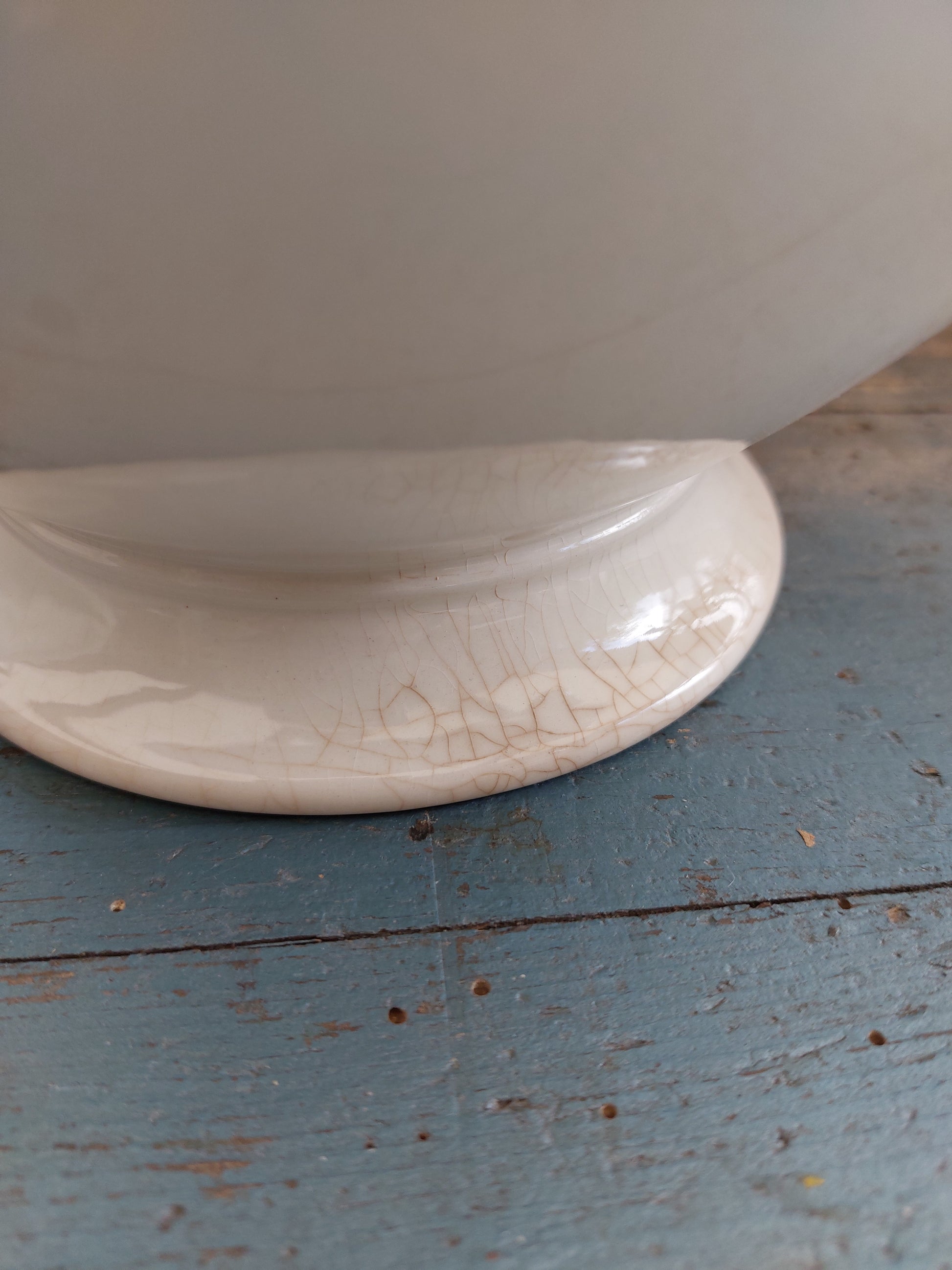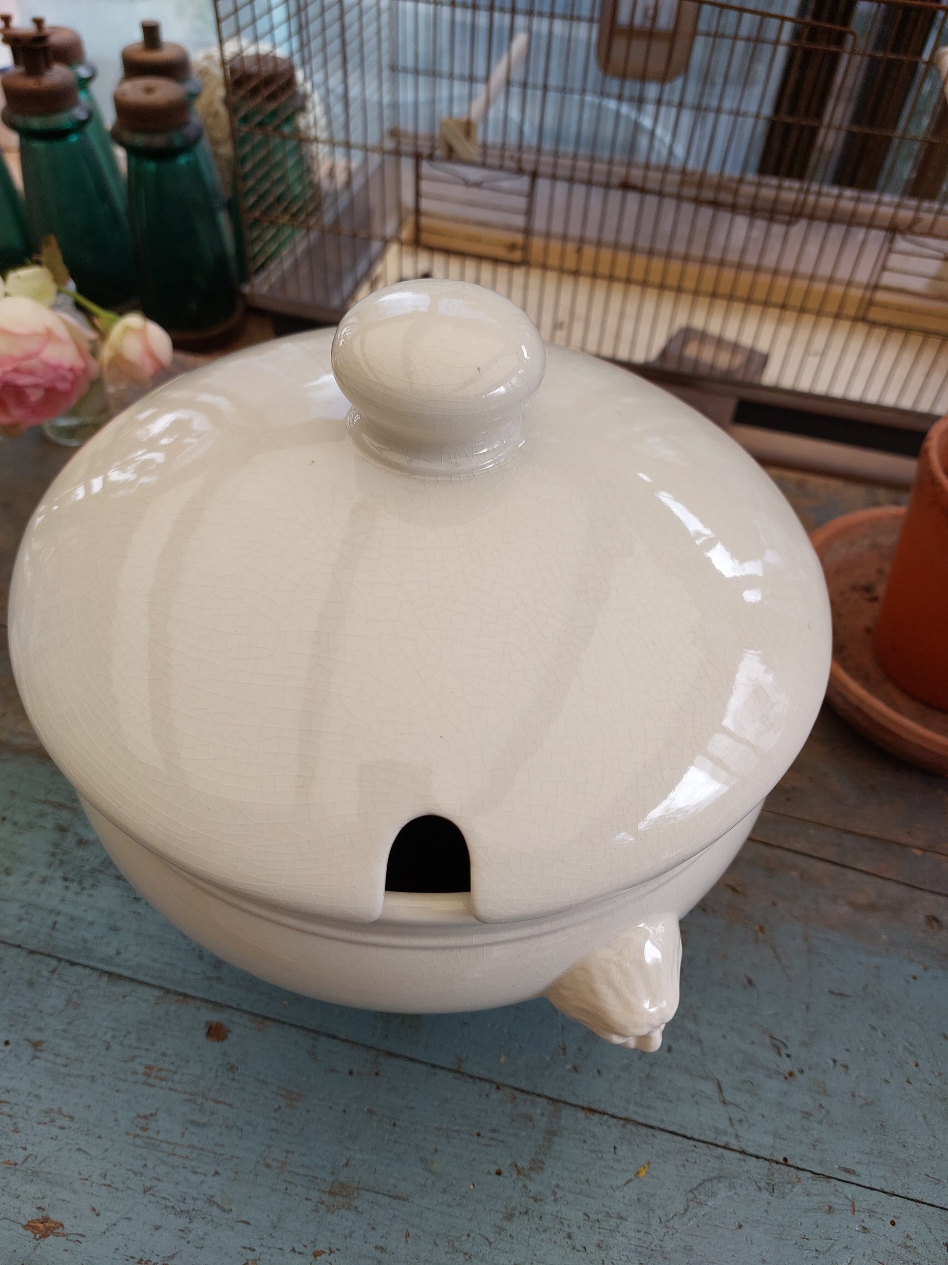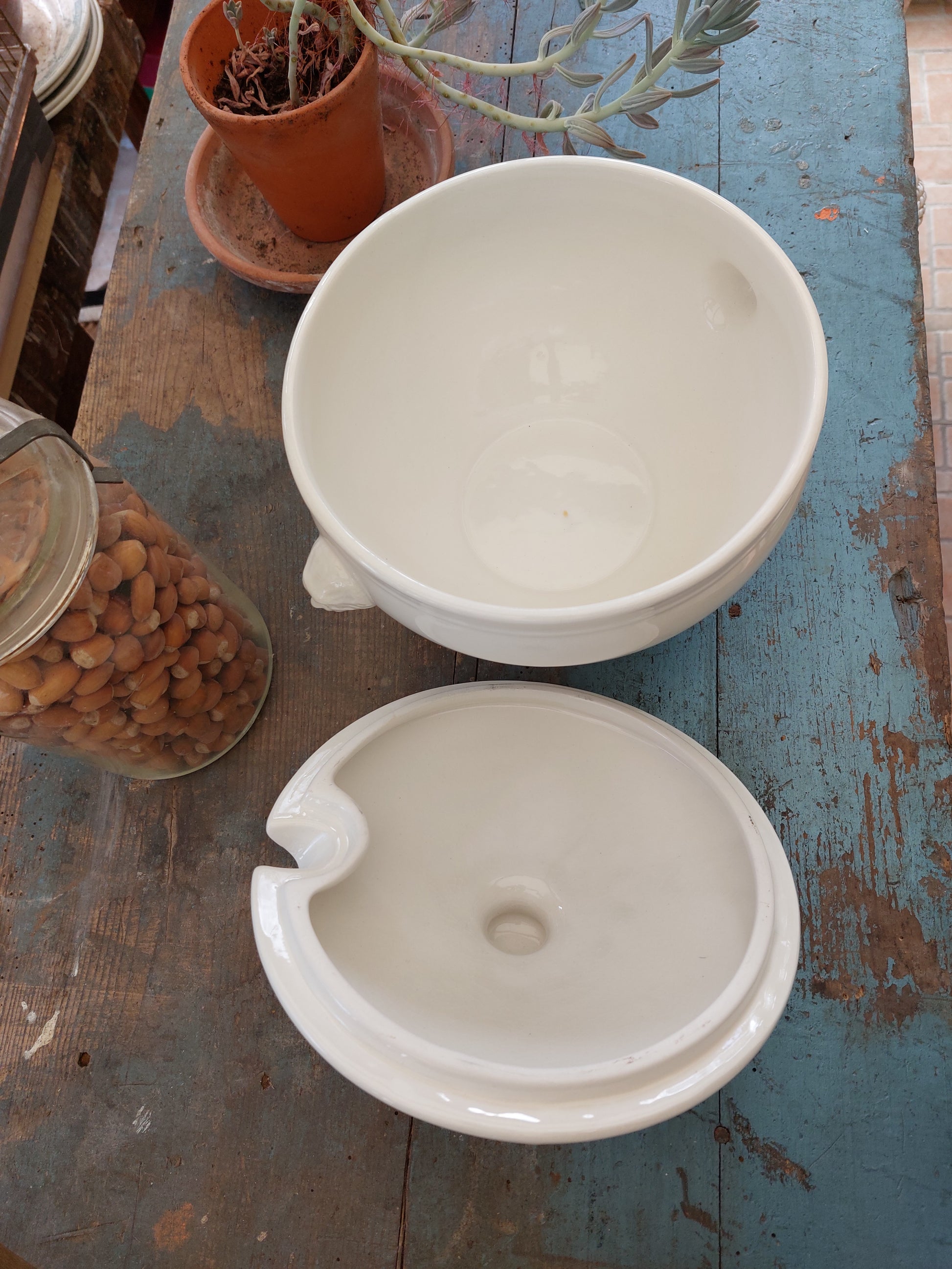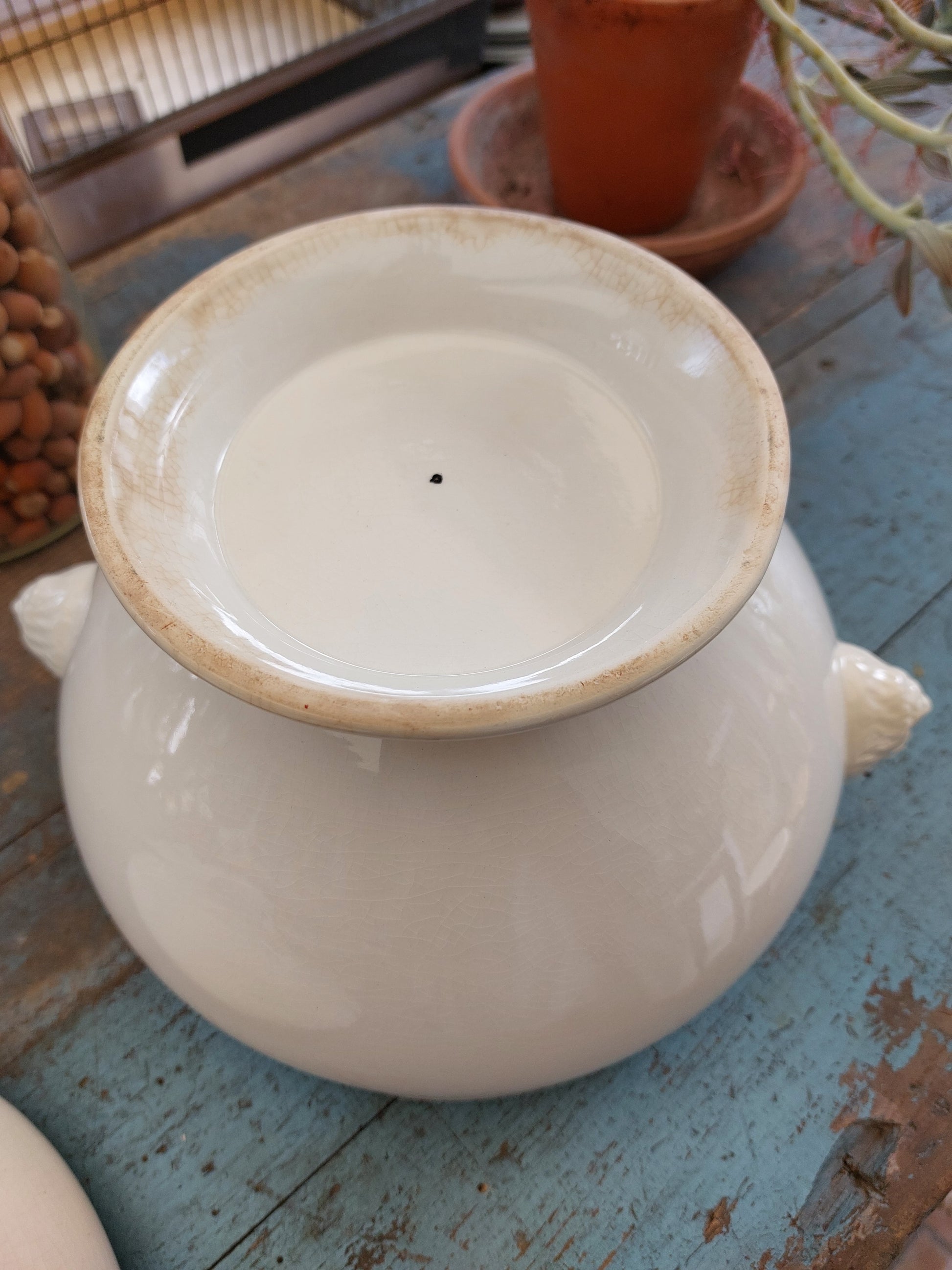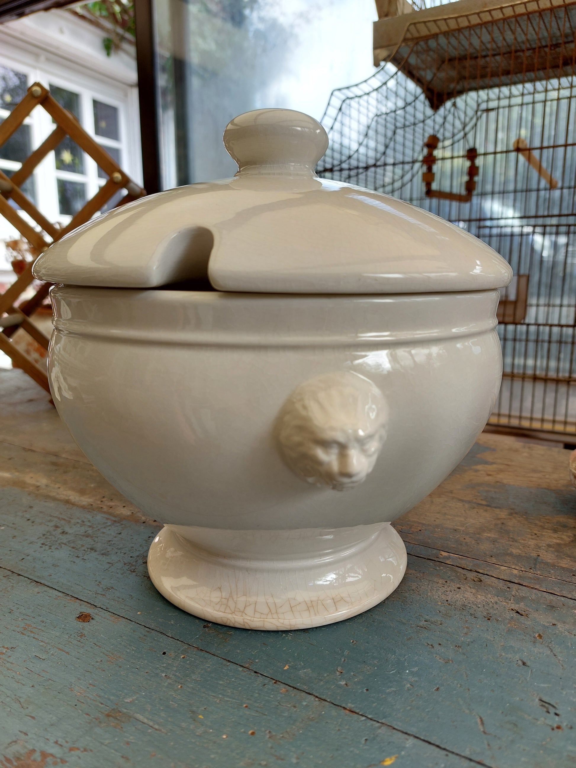 Grande soupière à tête de lion et son couvercle en porcelaine émaillée craquelée. Le couvercle vous permet de conserver vos plats bien chauds et garantit un réel effet de surprise !