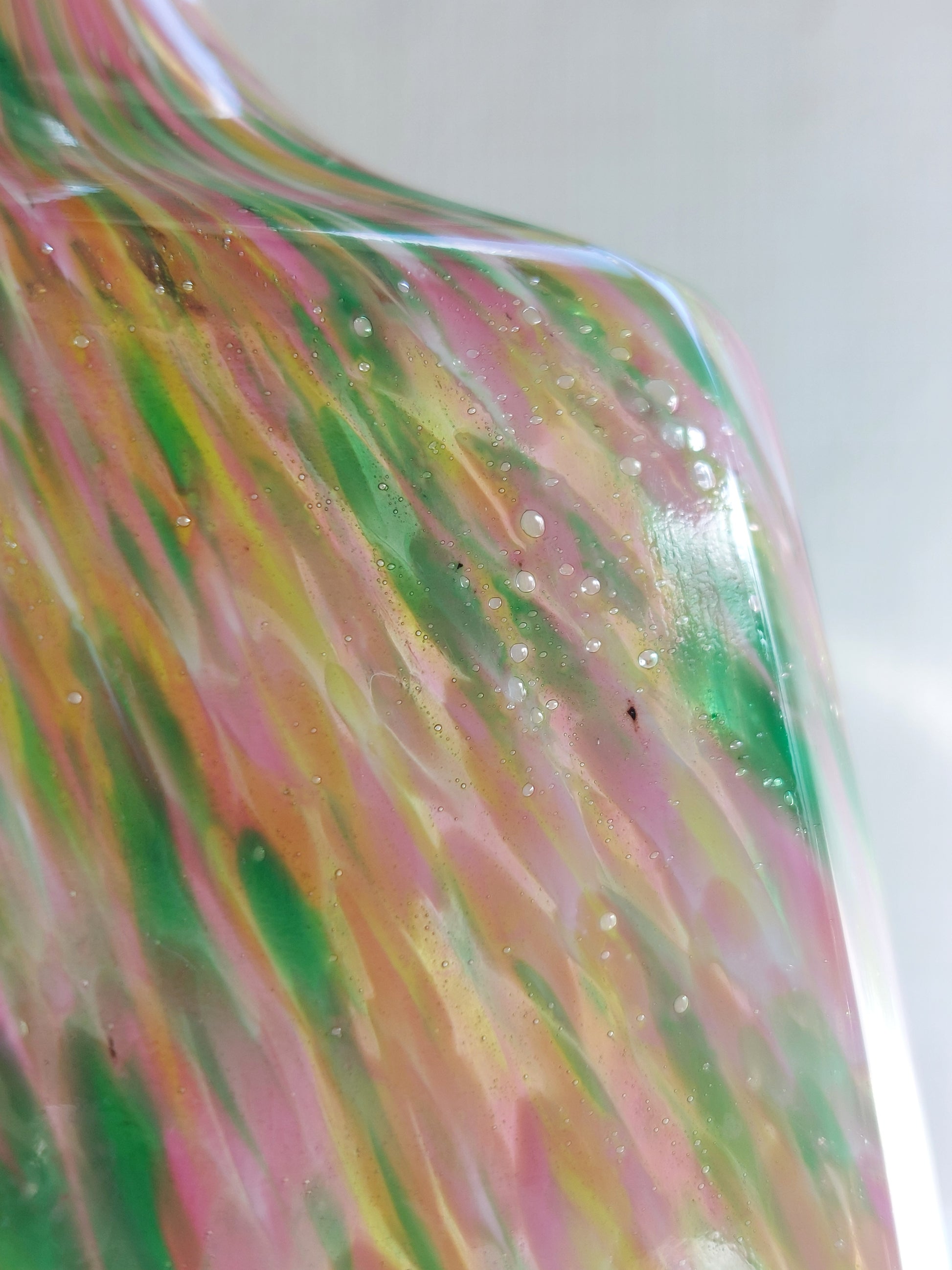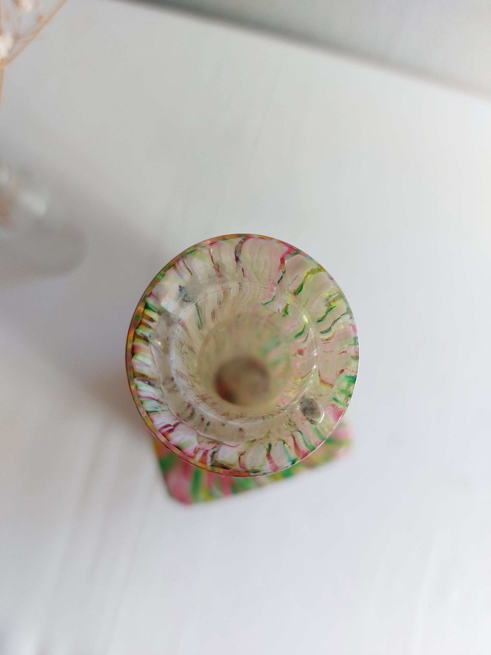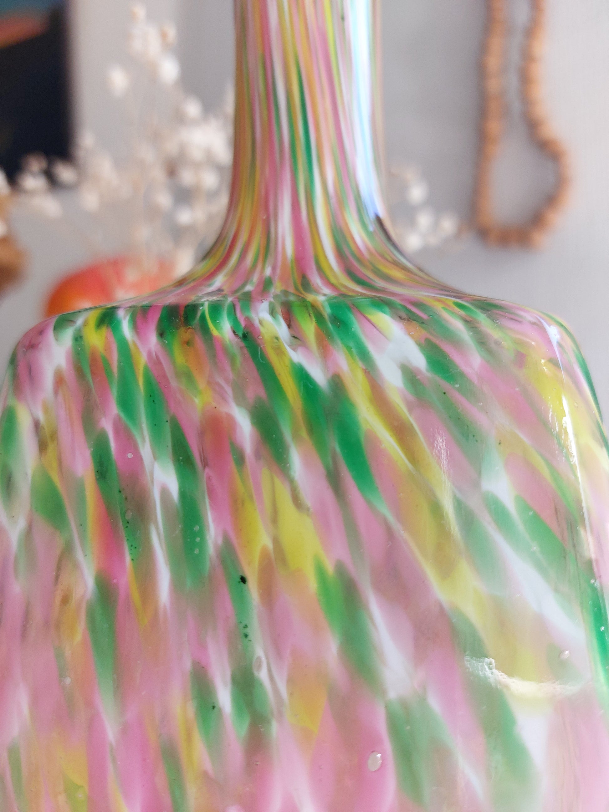 Ce très joli vase ancien possède des couleurs très acidulées, mélange de vert, jaune, rose et blanc. Il est en très bon état. En observant le base de très près, on peut distinguer quelques petites imperfections et des bulles qui sont liés à sa fabrication artisanale. On voit de manière très distincte la coloration dans la masse au niveau du col à la manière du millefiori. Très bel objet décoratif à base carrée et au long col fin. Objet chiné avec soin !