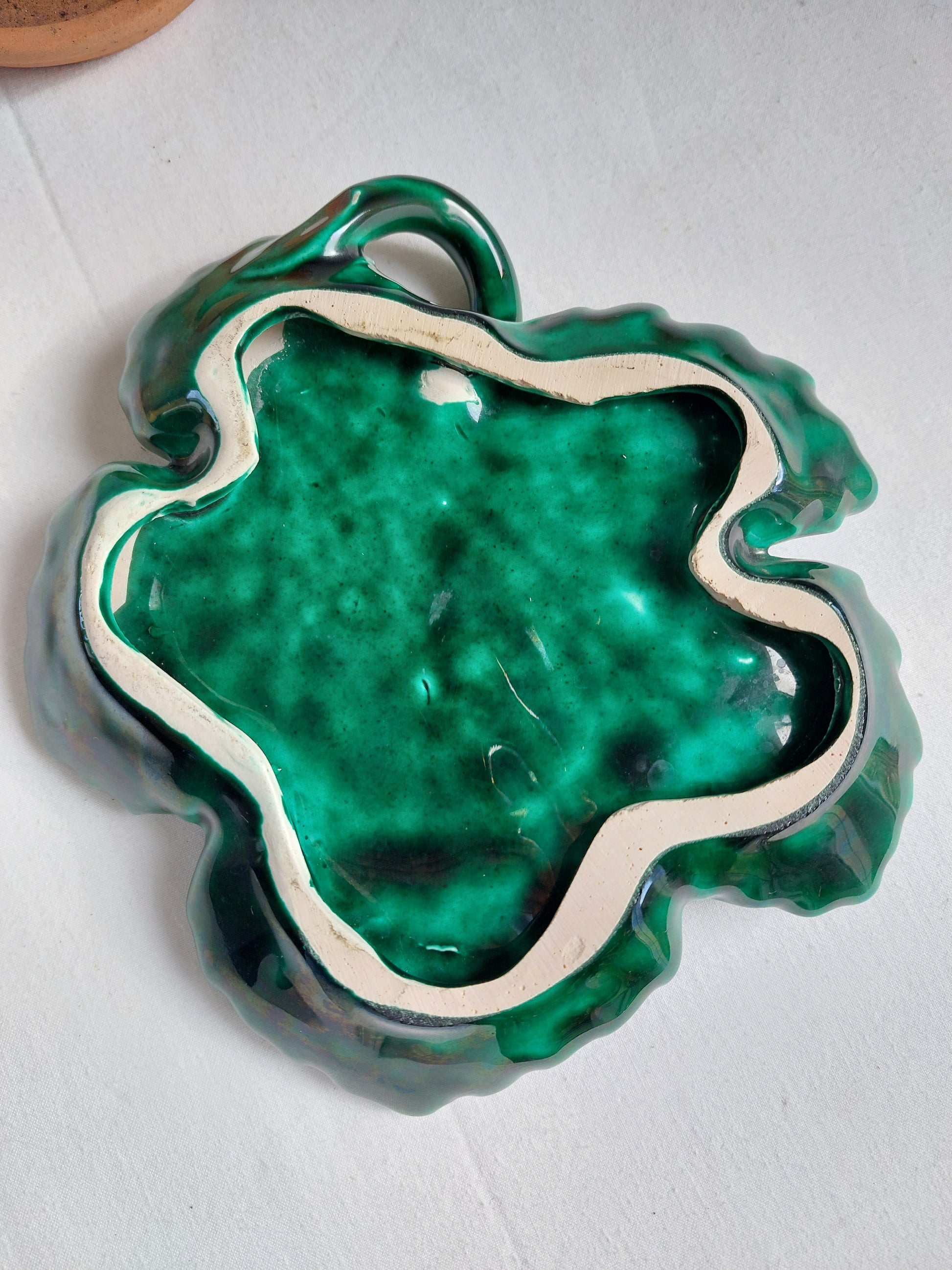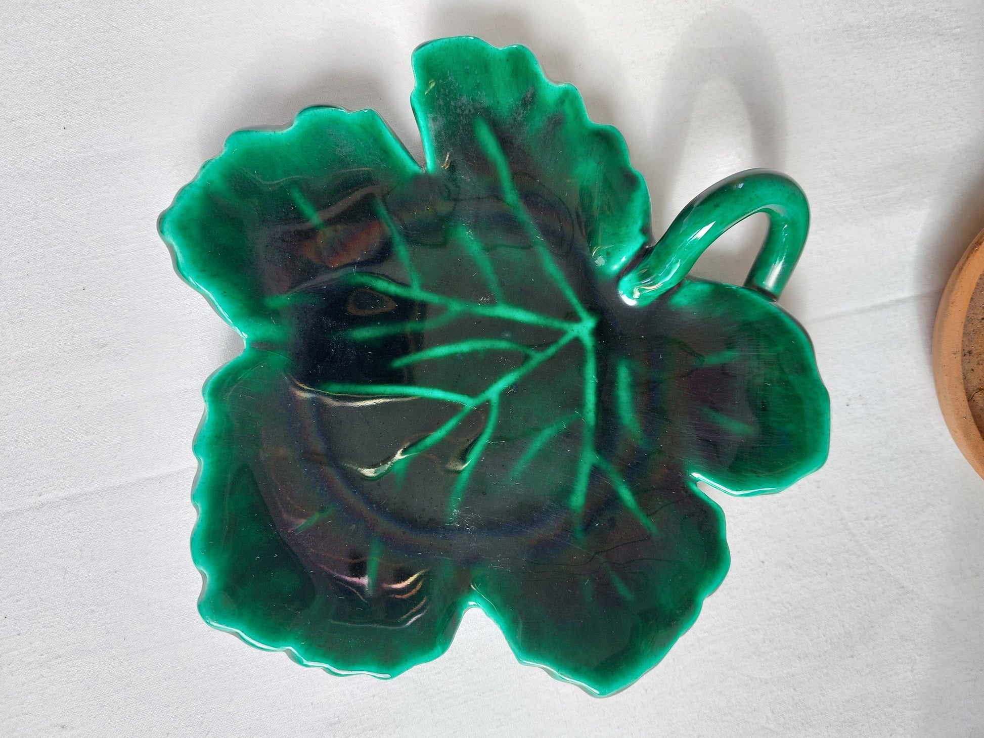 Petit vide poche en barbotine (faïence vernissée) représentant une feuille de vigne de couleur vert foncé. On peut voir les nervures de la feuille par transparence. Il est en bon état sans éclat ni fêle. Pour une touche d’élégance dans une entrée ou sur une table de nuit !